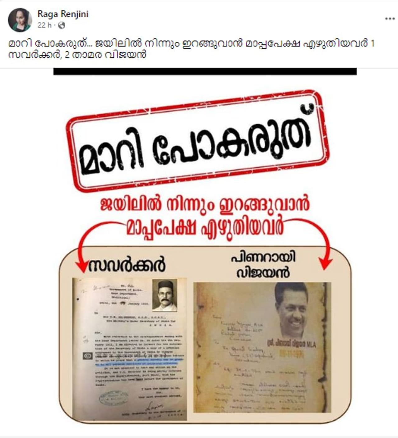 Raga Renjini, Shihab Karimpara, Shamee Maliyekkal, Deepa Higenus, കൊച്ചാപ്പ മലപ്പുറം, മലപ്പുറത്തെ യൂത്തൻമാർ, Sudhi Joseph തുടങ്ങി മറ്റ് നിരവധിയാളുകളും വി ഡി സവര്ക്കറും പിണറായി വിജയനും ജയില്മോചിതരാവാന് മാപ്പപേക്ഷിച്ചുകൊണ്ട് കത്ത് നല്കിയതായി ആരോപിക്കുന്ന കൊളാഷ് ഫേസ്ബുക്കില് പോസ്റ്റ് ചെയ്തിട്ടുണ്ട്. അവയുടെ സ്ക്രീന്ഷോട്ടുകളും ചുവടെ ചേര്ക്കുന്നു.