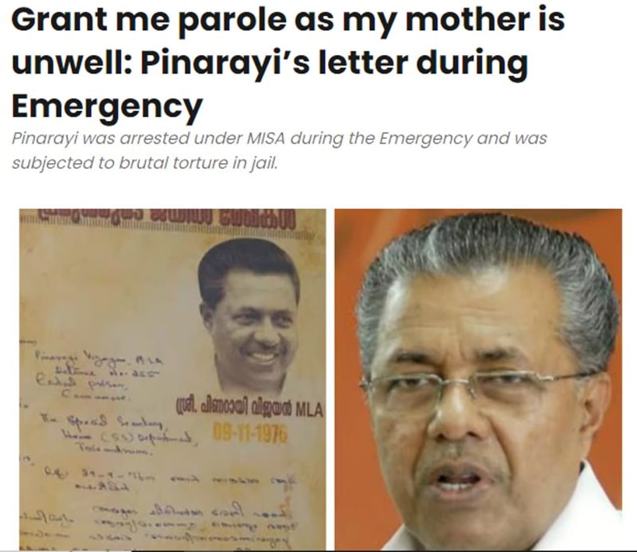 അമ്മയുടെ ചികില്സയ്ക്കായി തനിക്ക് പരോള് വേണമെന്ന് ആവശ്യപ്പെട്ട് പിണറായി വിജയന് 1976 നവംബര് 9ന് അടിയന്തിരാവസ്ഥാക്കാലത്ത് നല്കിയ കത്താണിത്. അടിയന്തിരാവസ്ഥയുടെ നാളുകളില് കൂത്തുപറമ്പ് എംഎല്എയായിരുന്നു അദേഹം. അന്ന് പിണറായി വിജയനെ 'മിസ' തടവുകാരായി കണ്ണൂര് സെന്ട്രല് ജയിലിലടച്ചിരിക്കുകയായിരുന്നു. ഇതിനിടെയാണ് അമ്മയുടെ അനാരോഗ്യം പരിഗണിച്ച് തനിക്ക് പരോള് വേണമെന്ന് ആവശ്യപ്പെട്ട് പിണറായി ആഭ്യന്തര സെക്രട്ടറിക്ക് കത്തെഴുതിയത് എന്ന് ദി ന്യൂസ് മിനുറ്റിന്റെ വാര്ത്തയില് വിശദീകരിക്കുന്നു. ജയിലില് വച്ച് പിണറായി മാപ്പിരക്കുകയായിരുന്നു എന്ന പ്രചാരണം വ്യാജമാണ് എന്ന് ഈ തെളിവുകളില് നിന്ന് വ്യക്തം.