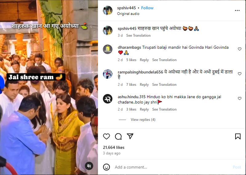ബോളിവുഡ് സ്റ്റാര് ഷാരൂഖ് ഖാന് അയോധ്യ രാമക്ഷേത്രത്തില് എത്തി എന്ന രീതിയില് പ്രചരിക്കുന്ന വീഡിയോ തെറ്റിദ്ധരിപ്പിക്കുന്നതാണ്. തിരുപ്പതി ക്ഷേത്രത്തില് നിന്നുള്ള വീഡിയോയാണിത്.