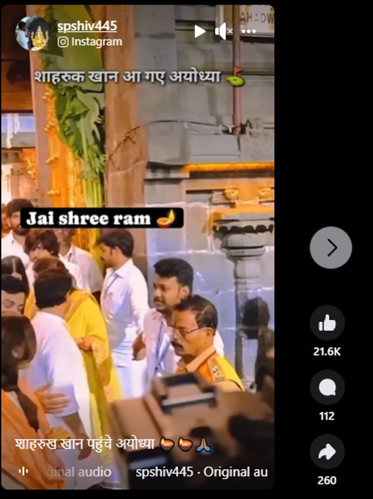 'അയോധ്യ രാമക്ഷേത്രം ഷാരൂഖ് ഖാന് സന്ദര്ശിച്ചു' എന്ന തരത്തില് റീല്സിലൂടെയാണ് പ്രചാരണമെല്ലാം. ഷാരൂഖ് ഏതോ അമ്പലത്തില് നിന്ന് കുടുംബസമേതം പുറത്തേക്ക് വരുന്നത് വീഡിയോയില് കാണാം. ഷാരൂഖ് ഖാന് അയോധ്യയിലെത്തി എന്ന തലക്കെട്ടിനൊപ്പം ജയ് ശ്രീറാം എന്ന എഴുത്തും റീലിലുണ്ട്. അയോധ്യയിലെ രാമക്ഷേത്ര പ്രതിഷ്ഠാ കര്മ്മത്തിന് ചലച്ചിത്ര താരങ്ങള് ഉള്പ്പടെ നിരവധി പ്രമുഖര്ക്ക് ക്ഷണം ലഭിച്ചിരുന്നു. എന്നാല് അത്തരം റിപ്പോര്ട്ടുകളിലൊന്നും ഷാരൂഖിന്റെ പേര് കാണാതിരുന്നതിനാല് അദേഹം അയോധ്യയിലെത്തിയതിന്റെ ദൃശ്യങ്ങള് തന്നെയോ ഇത് എന്ന സംശയമുയര്ന്നു. ഈ സാഹചര്യത്തില് വീഡിയോ വസ്തുതാ പരിശോധനയ്ക്ക് വിധേയമാക്കി.