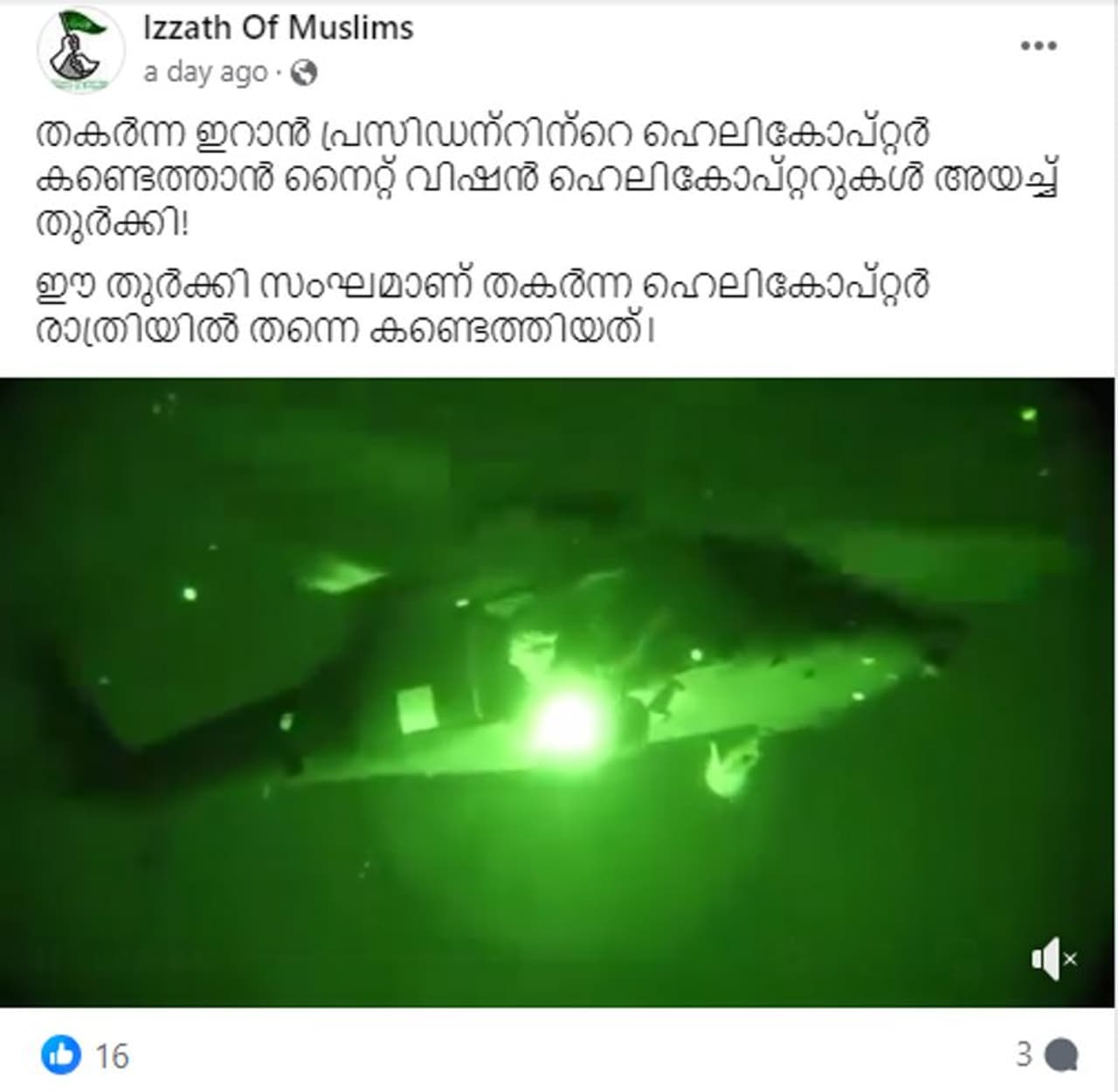 'തകർന്ന ഇറാൻ പ്രസിഡന്റിന്റെ ഹെലികോപ്റ്റർ കണ്ടെത്താൻ നൈറ്റ് വിഷൻ ഹെലികോപ്റ്ററുകൾ അയച്ച് തുർക്കി! ഈ തുർക്കി സംഘമാണ് തകർന്ന ഹെലികോപ്റ്റർ രാത്രിയിൽ തന്നെ കണ്ടെത്തിയത്'- എന്ന കുറിപ്പോടെയാണ് വീഡിയോ ഫേസ്ബുക്കില് പോസ്റ്റ് ചെയ്തിരിക്കുന്നത്. 33 സെക്കന്ഡാണ് വീഡിയോയുടെ ദൈര്ഘ്യം.