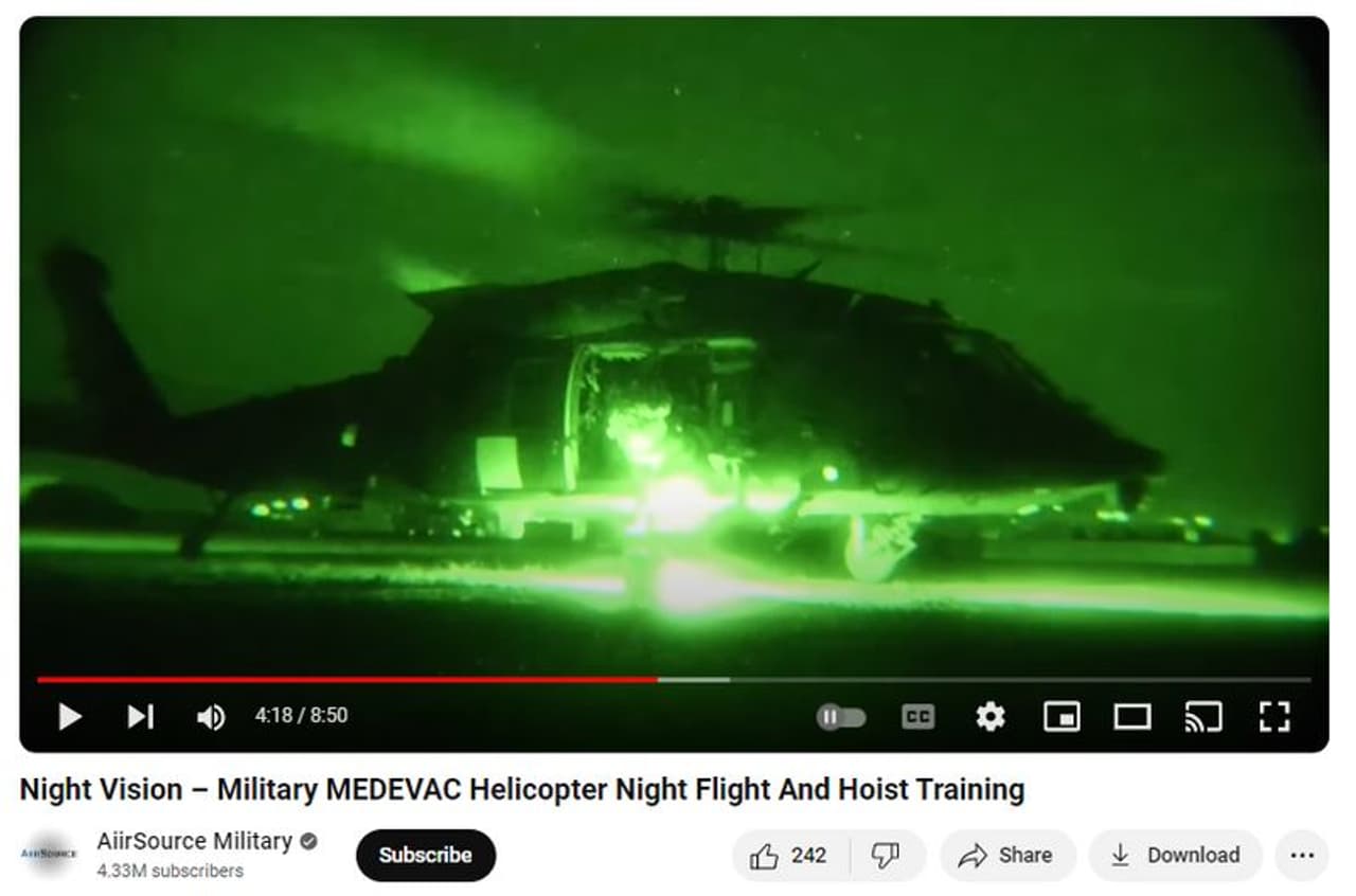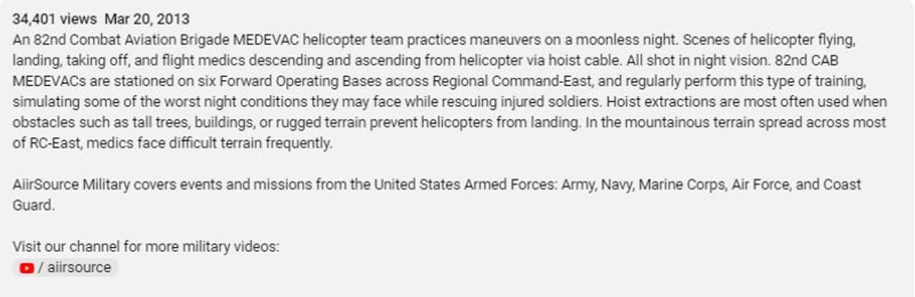 അമേരിക്കന് നാവികസേനയുടെ ഭാഗമായ 82nd Combat Aviation Brigade 2012 ഏപ്രില് 13ന് അഫ്ഗാനിസ്ഥാന് പ്രവിശ്യയില് നടത്തിയ രാത്രികാല പരിശീലനത്തിന്റെ ദൃശ്യങ്ങളാണിത് ഇതെന്നാണ് ലഭ്യമായ വിവരങ്ങളില് നിന്ന് മനസിലാവുന്നത്.