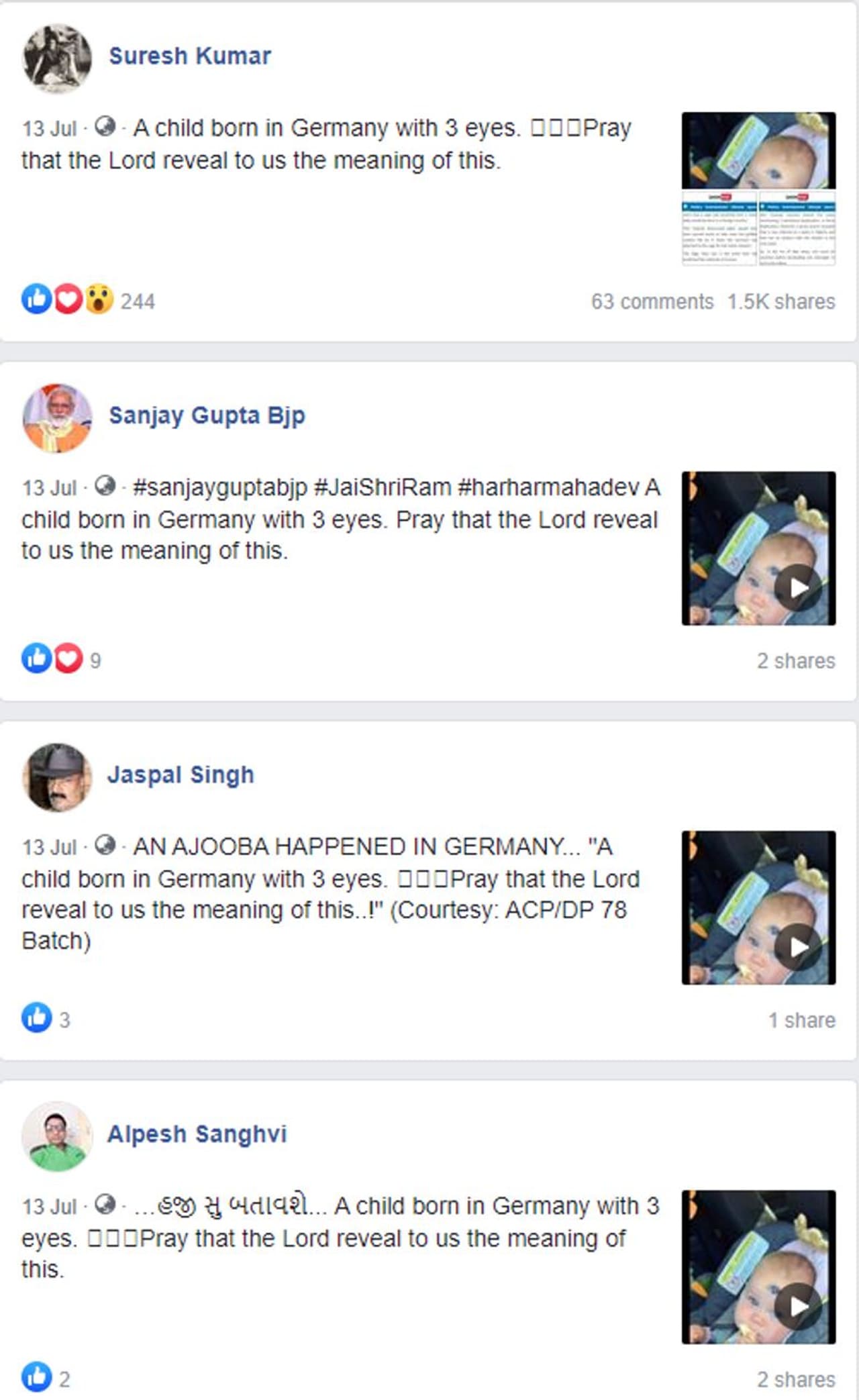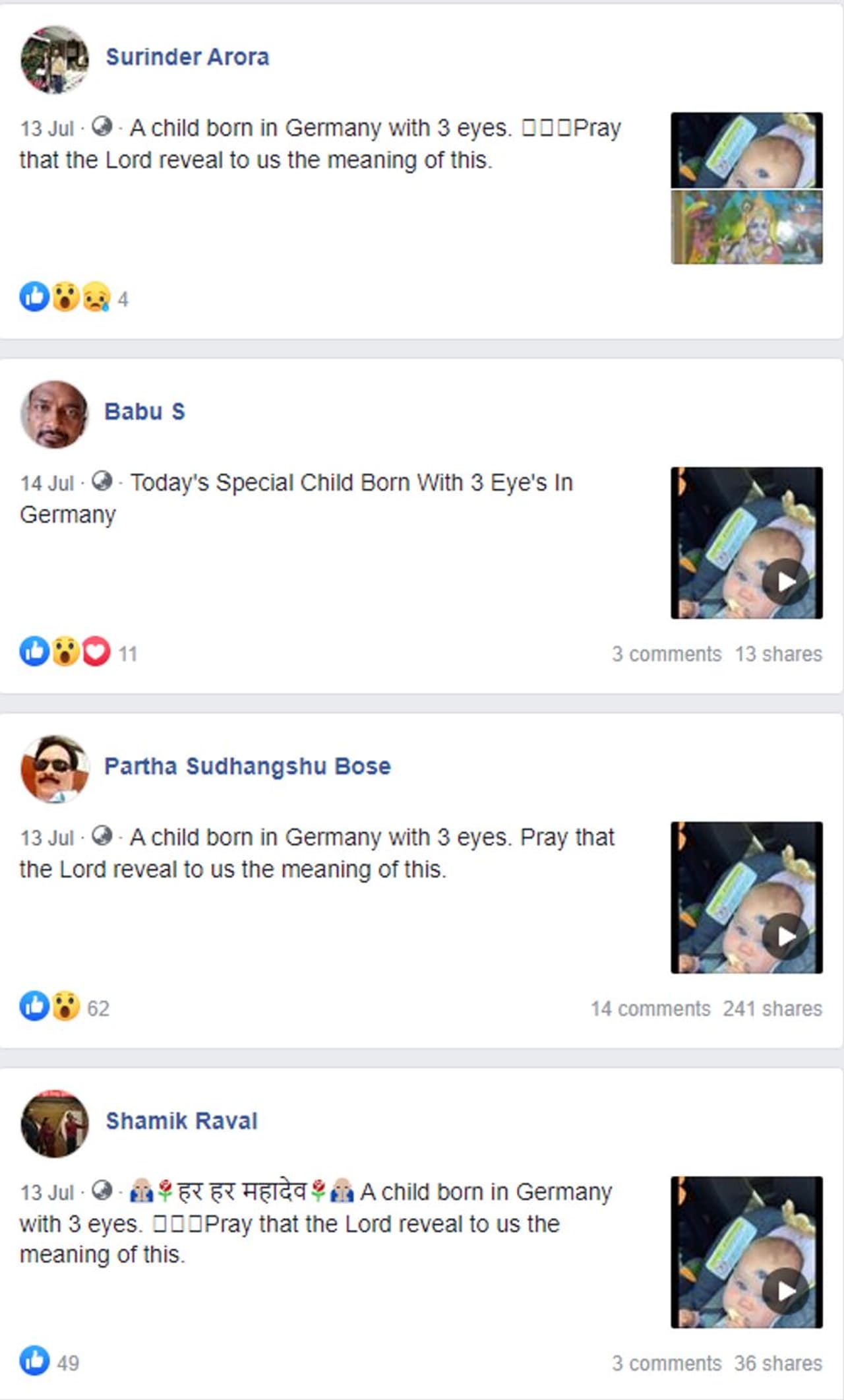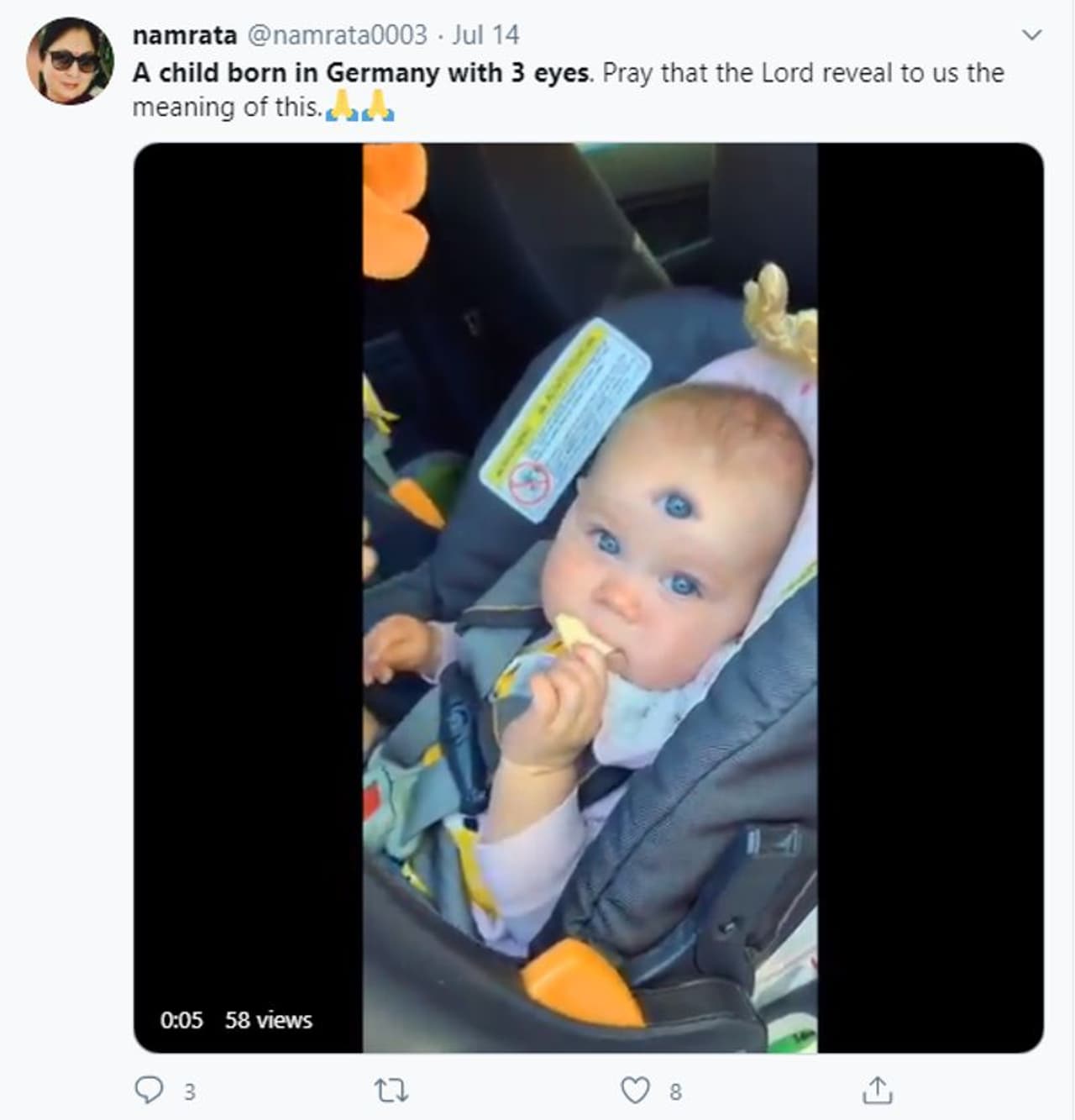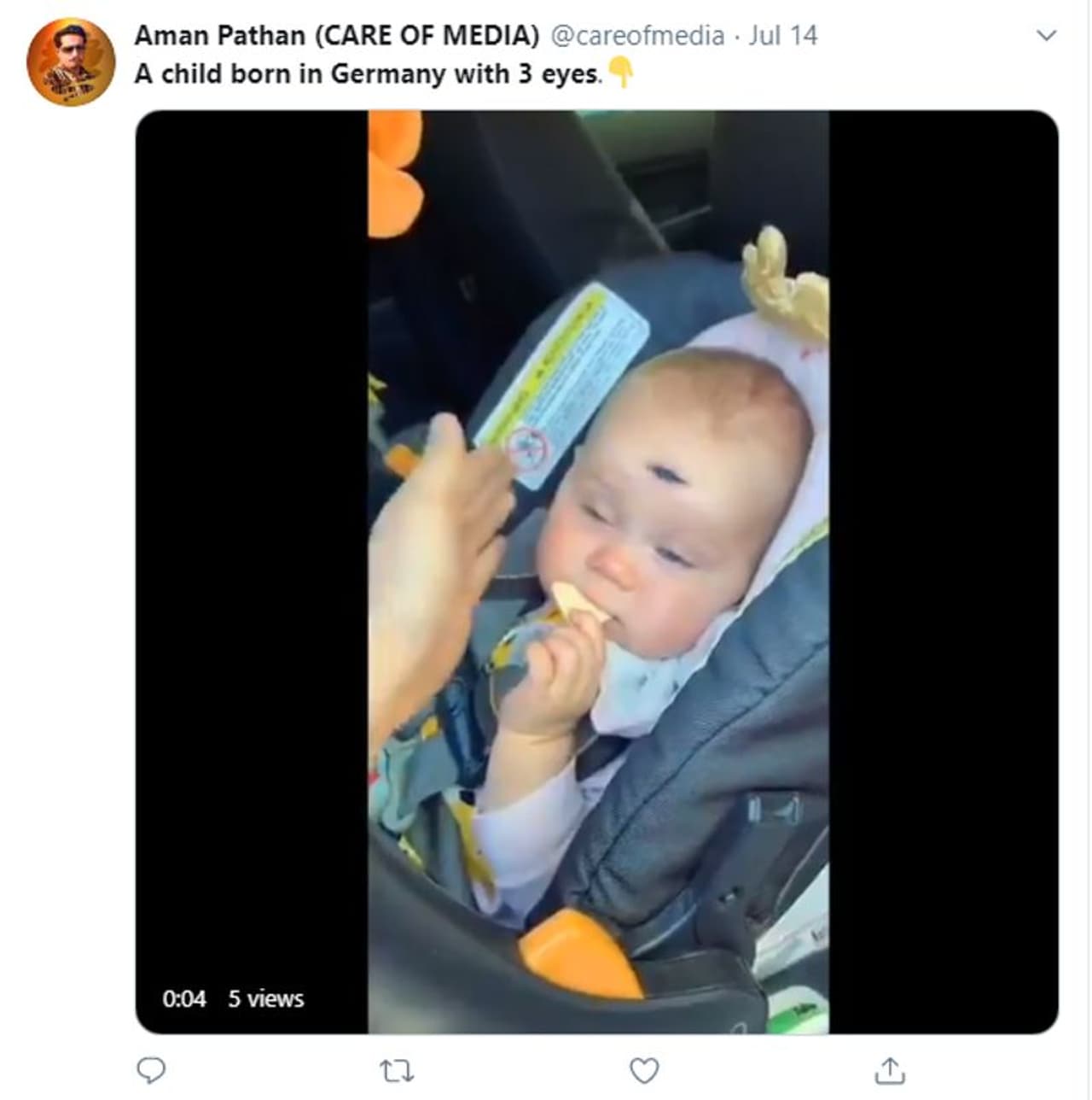 ജര്മനിയില് മൂന്ന് കണ്ണുകളുമായി ഒരു കുട്ടി ജനിച്ചെന്ന വീഡിയോ വ്യാജമാണ്. നെറ്റിയിലായി പ്രത്യക്ഷപ്പെട്ട കണ്ണ് എഡിറ്റ് ചെയ്ത് ചേര്ത്തതാണ് എന്നാണ് തെളിഞ്ഞത്.