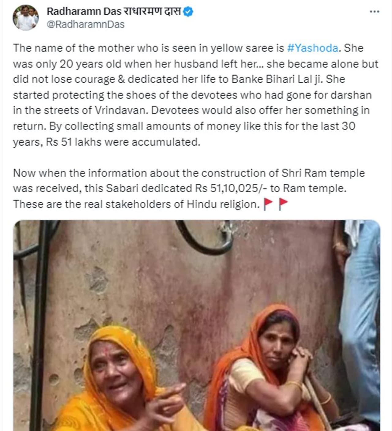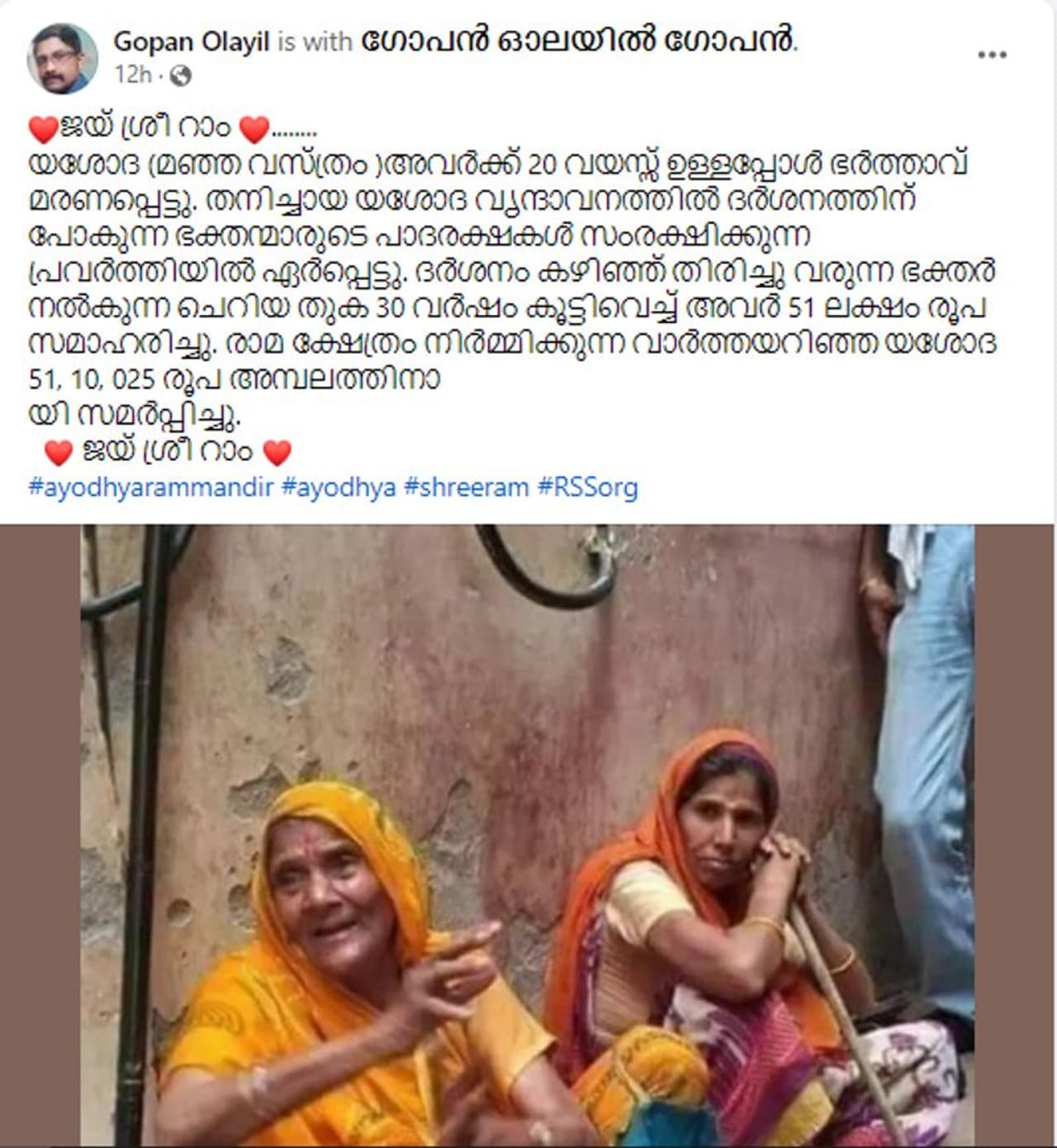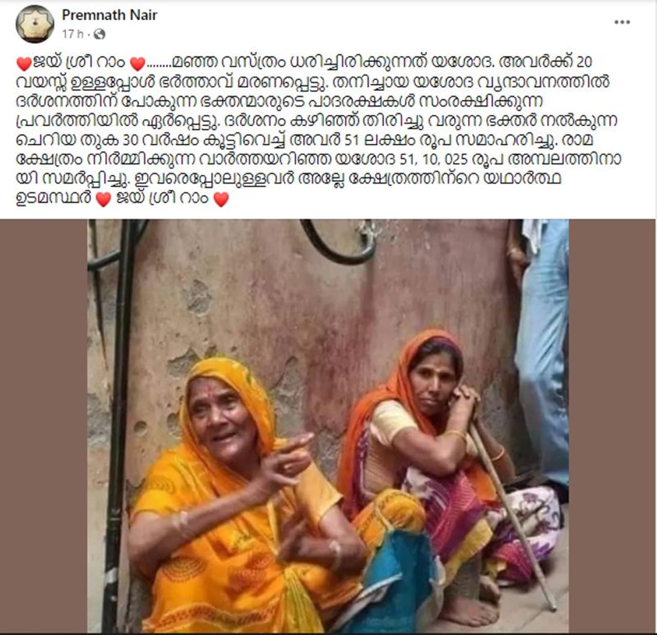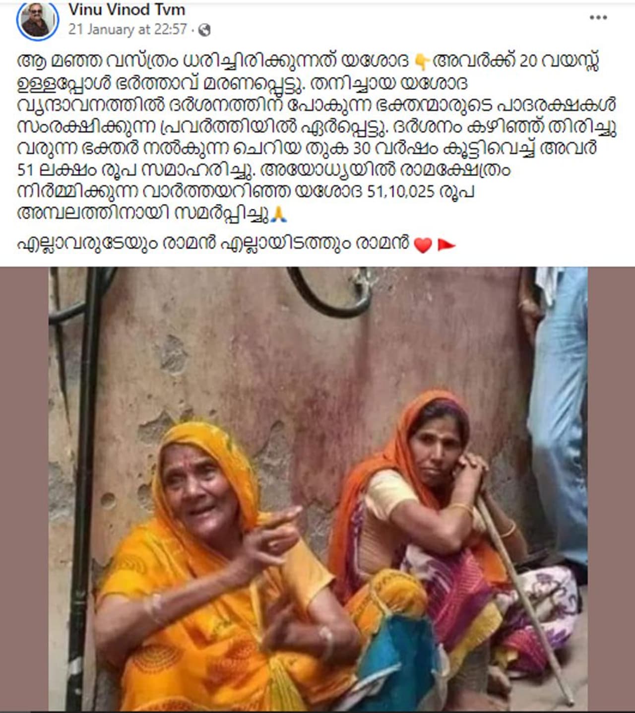 'ആ മഞ്ഞ വസ്ത്രം ധരിച്ചിരിക്കുന്നത് യശോദ 👇അവർക്ക് 20 വയസ്സ് ഉള്ളപ്പോൾ ഭർത്താവ് മരണപ്പെട്ടു. തനിച്ചായ യശോദ വൃന്ദാവനത്തിൽ ദർശനത്തിന് പോകുന്ന ഭക്തന്മാരുടെ പാദരക്ഷകൾ സംരക്ഷിക്കുന്ന പ്രവർത്തിയിൽ ഏർപ്പെട്ടു. ദർശനം കഴിഞ്ഞ് തിരിച്ചു വരുന്ന ഭക്തർ നൽകുന്ന ചെറിയ തുക 30 വർഷം കൂട്ടിവെച്ച് അവർ 51 ലക്ഷം രൂപ സമാഹരിച്ചു. അയോധ്യയിൽ രാമക്ഷേത്രം നിർമ്മിക്കുന്ന വാർത്തയറിഞ്ഞ യശോദ 51,10,025 രൂപ അമ്പലത്തിനായി സമർപ്പിച്ചു🙏 എല്ലാവരുടേയും രാമൻ എല്ലായിടത്തും രാമൻ'.