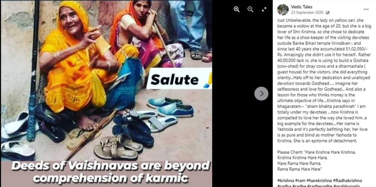 യശോദ എന്ന് പേരുള്ള വിധവ അയോധ്യയില് രാമക്ഷേത്രം നിര്മിക്കാന് 50 ലക്ഷം രൂപ സംഭാവന നല്കിയതായുള്ള പ്രചാരണം വ്യാജമാണ്. ഫൂല്വതി എന്ന സ്ത്രീയുടെ 2017 മുതല് ഇന്റര്നെറ്റില് ലഭ്യമായ ഫോട്ടോ ഉപയോഗിച്ചാണ് വ്യാജ പ്രചാരണം മലയാളത്തിലടക്കം തകൃതിയായി നടക്കുന്നത്.