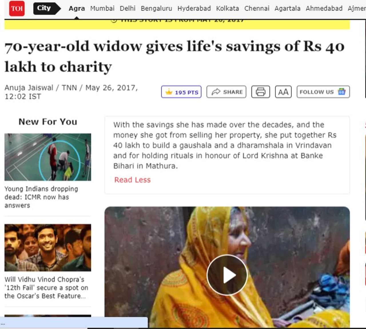 ഇക്കാര്യം ഒന്നുകൂടി ഉറപ്പിക്കാന് കീവേഡ് സെര്ച്ചും നടത്തി. ഇതില് ദേശീയ മാധ്യമമായ ടൈംസ് ഓഫ് ഇന്ത്യ 2017 മെയ് 26ന് പ്രസിദ്ധീകരിച്ച വാര്ത്ത കണ്ടെത്താനായി. മധ്യപ്രദേശിലെ കത്നിയില് നിന്നുള്ള 70 വയസുകാരിയായ വിധവ ഫൂല്വതി ഗോശാല നിര്മിക്കാന് 40 ലക്ഷം രൂപ നല്കി എന്നാണ് ഈ വാര്ത്ത. ഭര്ത്താവിന്റെ മരണ ശേഷം ഫൂല്വതി മഥുരയിലേക്ക് 1982ല് വരികയായിരുന്നു. ബാങ്കേ ബിഹാരി ക്ഷേത്രത്തില് എത്തുന്നവരുടെ ഷൂസുകള് രണ്ടാം നമ്പര് ഗേറ്റില് സൂക്ഷിക്കുന്ന തൊഴിലെടുത്തും കത്നിയിലുള്ള വസ്തു വിറ്റ് സമാഹരിച്ച തുകയും ചേര്ത്താണ് ഫൂല്വതി ഇത്രയും വലിയ തുക സമാഹരിച്ചത് എന്ന് വാര്ത്തയില് വിശദമാക്കുന്നു.
