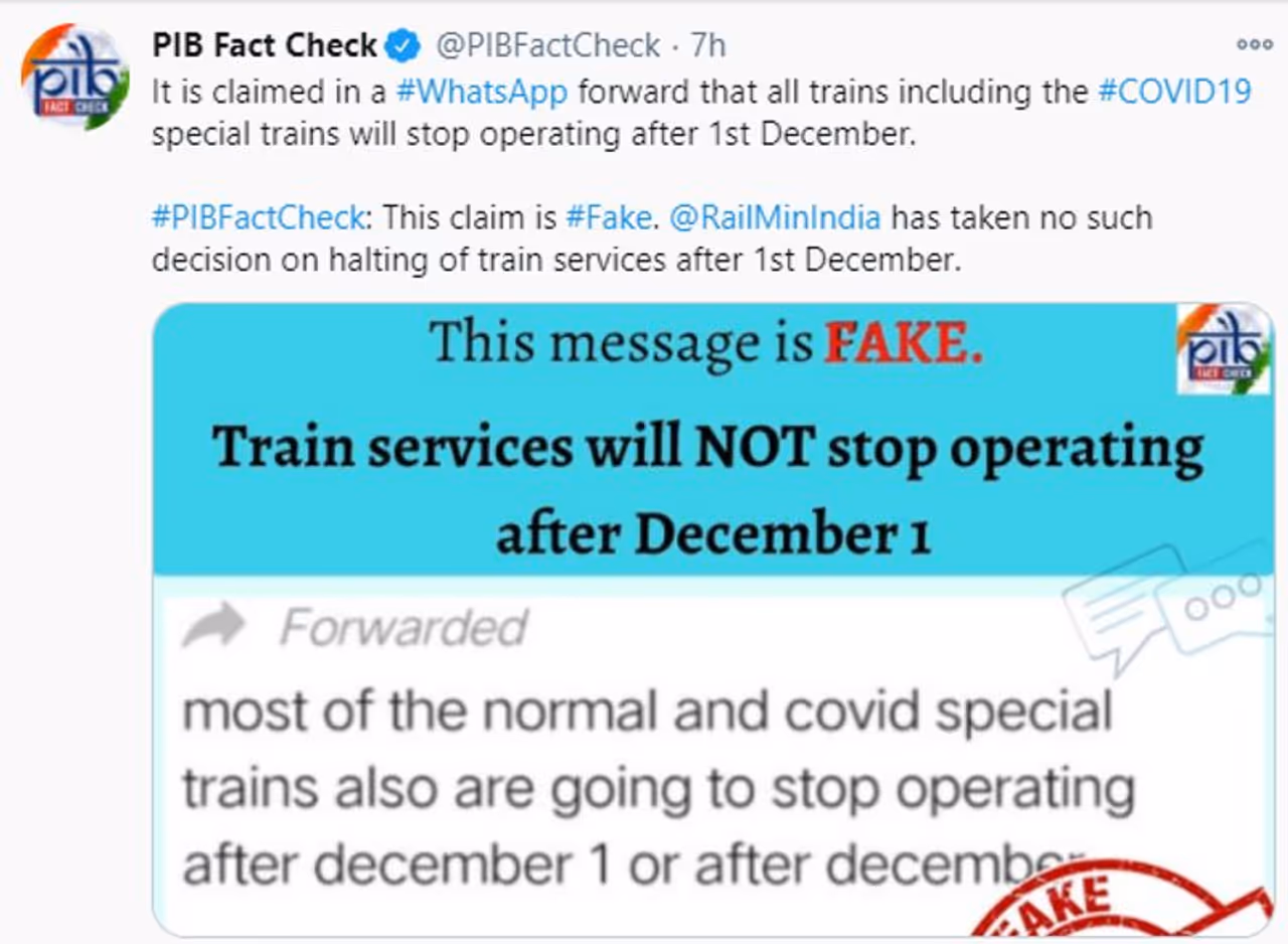 ദില്ലി: രാജ്യത്ത് കൊവിഡ് കാലത്ത് നൂറുകണക്കിന് വ്യാജ സന്ദേശങ്ങളാണ് സാമൂഹ്യമാധ്യമങ്ങളില് പ്രചരിച്ചത്. സത്യമേത്, വ്യാജമേത് എന്ന് തിരിച്ചറിയാന് കഴിയാത്ത രീതിയിലാണ് വൈറല് സന്ദേശങ്ങളുടെ പ്രളയം. കൊവിഡ് തുടരുന്ന സാഹചര്യത്തില് ഡിസംബര് ഒന്നിന് ശേഷം സ്പെഷ്യല് ട്രെയിനുകള് ഉള്പ്പടെ എല്ലാ സര്വീസുകളും ഇന്ത്യന് റെയില്വേ അവസാനിപ്പിക്കും എന്നാണ് പുതിയ സന്ദേശം. എന്താണ് ഇതിന്റെ വസ്തുത?