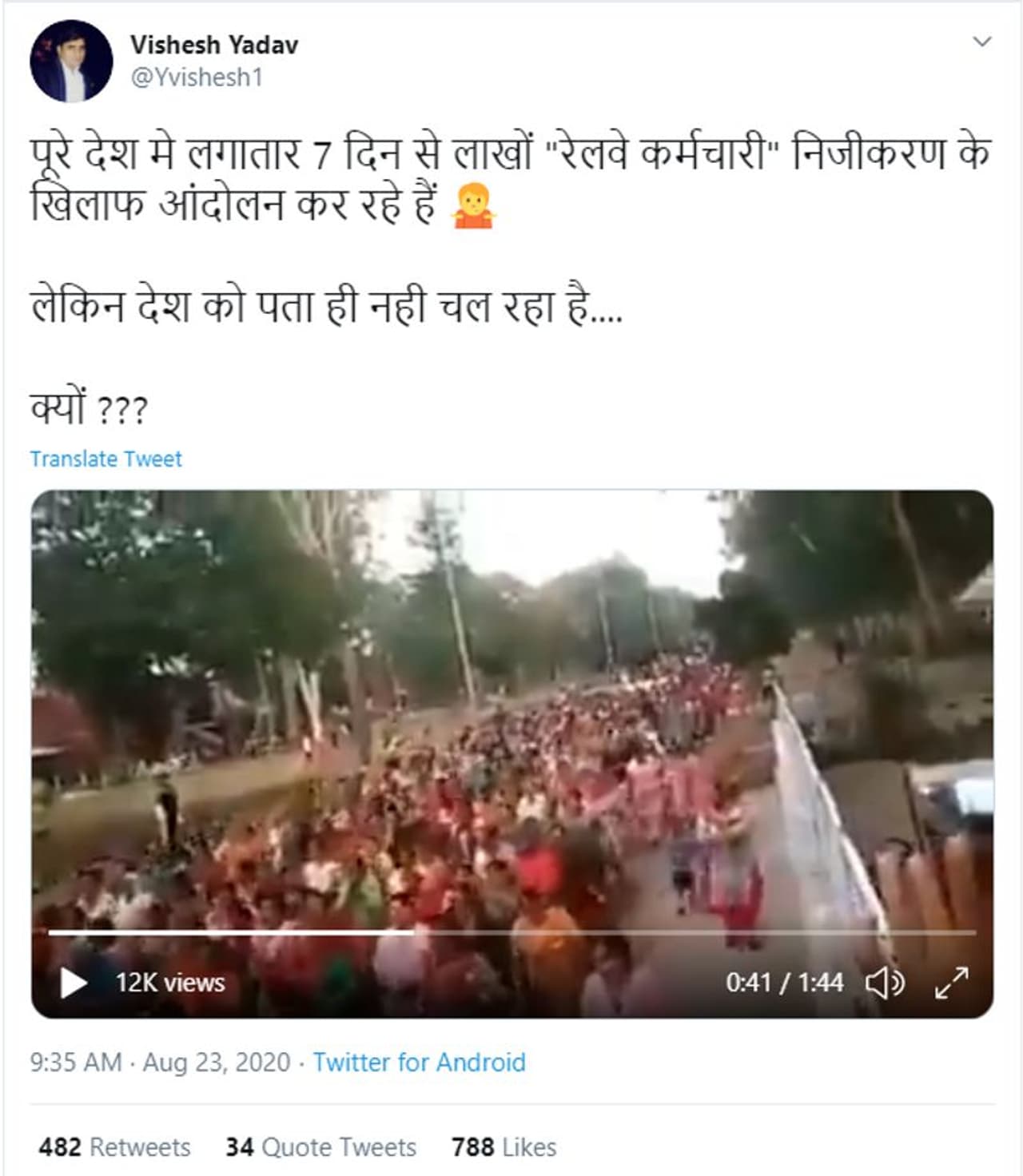അമന്ജീത് സിംഗ് എന്ന ഫേസ്ബുക്ക് യൂസറാണ് ജൂലൈ 28ന് വീഡിയോ പോസ്റ്റ് ചെയ്തത്. റെയില്വേയിലെ സ്വകാര്യവല്ക്കരണത്തിനെതിരെ ദശലക്ഷക്കണക്കിന് തൊഴിലാളികള് കഴിഞ്ഞ ഏഴ് ദിവസമായി പ്രക്ഷോഭത്തിലാണ് എന്നാണ് വീഡിയോയ്ക്ക് ഒപ്പമുള്ള തലക്കെട്ടില് പറയുന്നത്. ഇതിനകം 18 ലക്ഷം പേര് വീഡിയോ കാണുകയും 50,000ത്തിലേറെ ഷെയര് ലഭിക്കുകയും ചെയ്തു.