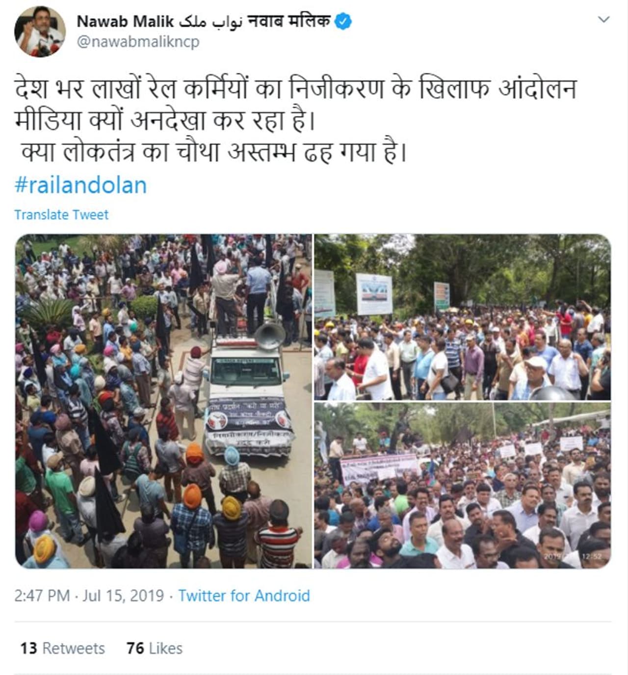 റെയില്വേ കോച്ച് ഫാക്ടറി സ്വകാര്യവല്ക്കരിക്കുന്നതിനെതിരെ ജീവനക്കാര് നടത്തിയ പ്രതിഷേധ റാലിയാണ് ഇതെന്നാണ് വാര്ത്തയില് പറയുന്നത്. പ്രചരിക്കുന്ന ചിത്രം എന്സിപി നേതാവും മഹാരാഷ്ട്ര മന്ത്രിയുമായ നവാബ് മാലിക് 2019 ജൂലൈ 15ന് ട്വീറ്റ് ചെയ്തിട്ടുള്ളതാണ് എന്നും കണ്ടെത്തി.