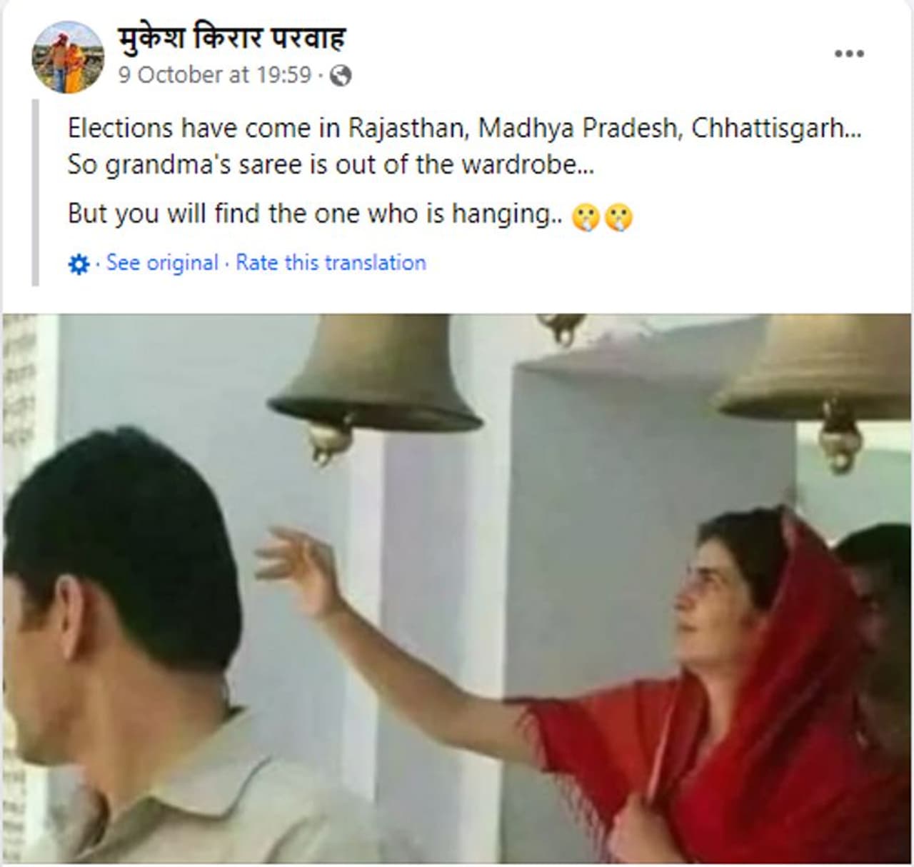 ഛത്തീസ്ഗഢ്, മധ്യപ്രദേശ്, രാജസ്ഥാന്... സംസ്ഥാനങ്ങളില് തെരഞ്ഞെടുപ്പ് വരികയാണ്. അതിനാല് മുത്തശ്ശിയുടെ സാരി അലമാരയില് നിന്ന് പുറത്തുവന്നിരിക്കുന്നു എന്നുമാണ് 2023 ഒക്ടോബര് 9ന് ഫേസ്ബുക്കില് പോസ്റ്റ് ചെയ്തിരിക്കുന്ന ചിത്രത്തിനൊപ്പമുള്ള കുറിപ്പില് പറയുന്നത്. ചുവപ്പ് നിറത്തിലുള്ള സാരിയണിഞ്ഞ പ്രിയങ്ക ഗാന്ധി വദ്ര ക്ഷേത്രത്തിലെ മണിയടിക്കുന്നതായാണ് ചിത്രം. പോസ്റ്റില് പറയുന്നത് സത്യമോ എന്ന് പരിശോധിക്കാം.