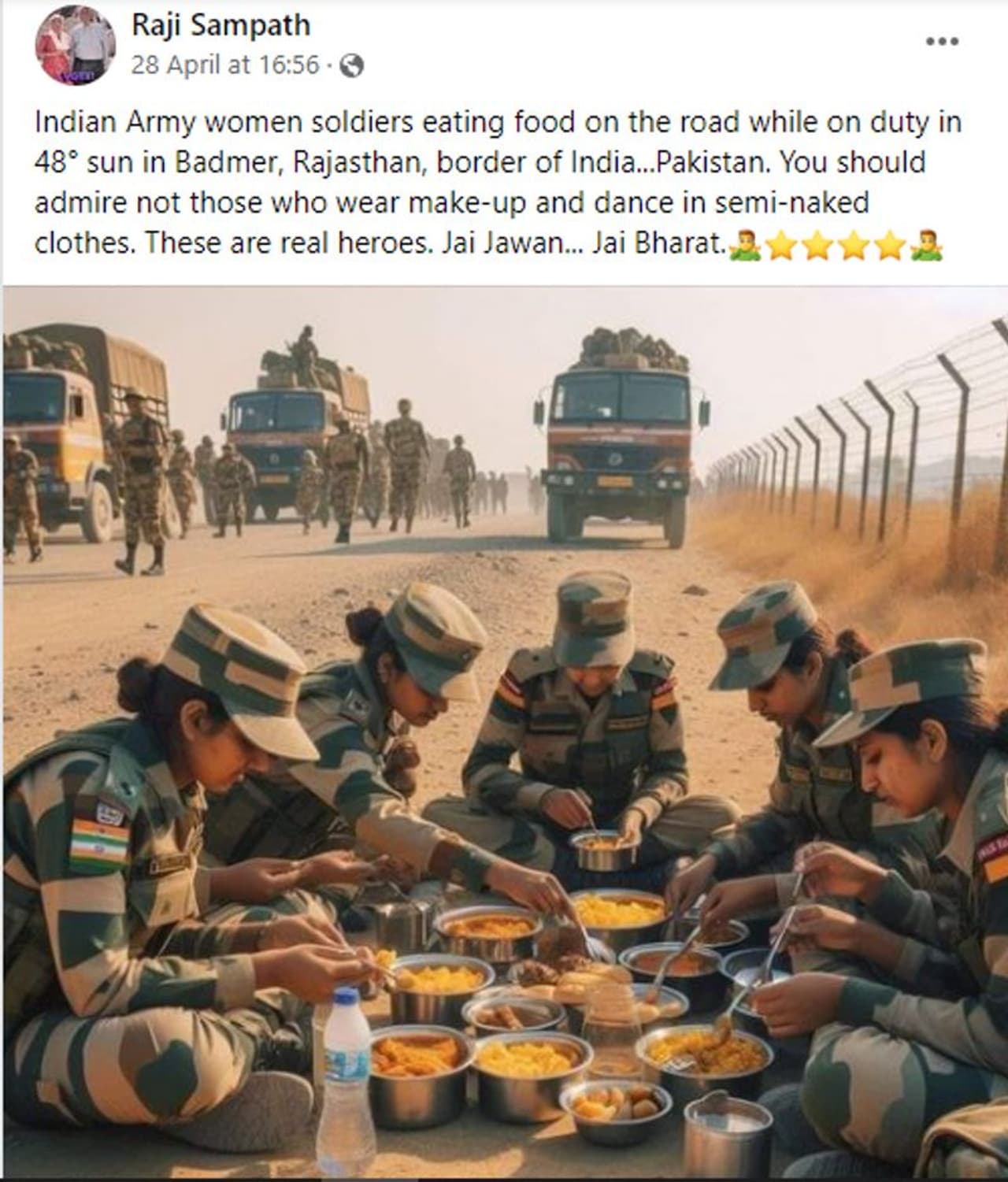48 ഡിഗ്രി ചൂടില് റോഡിലിരുന്ന് വനിത സൈനികര് ഭക്ഷണം കഴിക്കുന്നു എന്ന അവകാശവാദത്തോടെയുള്ള ചിത്രം യഥാര്ഥമല്ല, എഐ നിര്മിതമാണ്.
