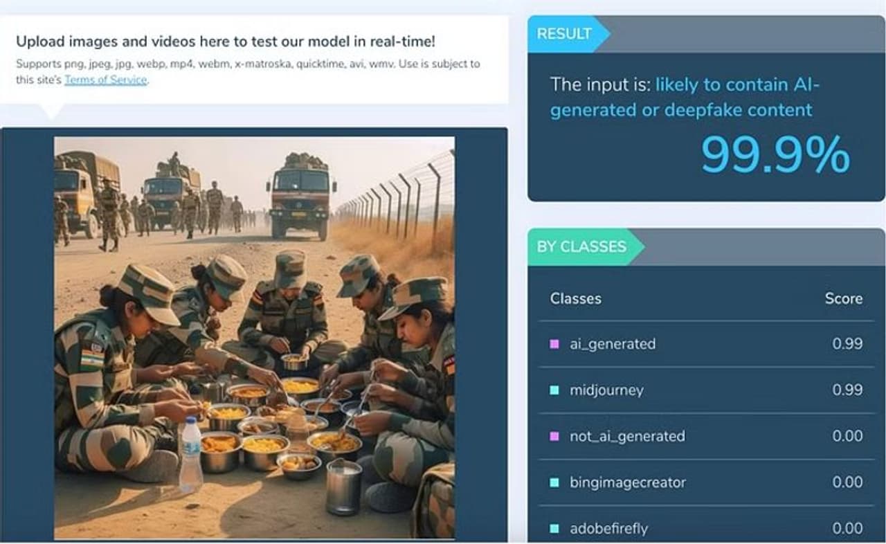 പ്രചരിക്കുന്ന ഈ ഫോട്ടോ ആര്ട്ടിഫിഷ്യല് ഇന്റലിജന്സ് സാങ്കേതികവിദ്യയുടെ സഹായത്തോടെ തയ്യാറാക്കിയതാണ് എന്നതാണ് യാഥാര്ഥ്യം. പ്രചരിക്കുന്ന ഫോട്ടോ സൂക്ഷിച്ച് നോക്കിയാല് ഇതിലൊരു സൈനികയ്ക്ക് മൂന്ന് കൈകള് കാണാം. ആരുടേത് എന്ന് വ്യക്തമല്ലാത്ത രീതിയില് മറ്റ് രണ്ട് കൈകളും ചിത്രത്തില് കാണാം. ഇതാണ് ഫോട്ടോ എഐ ആണ് എന്ന സൂചന നല്കിയത്. ആര്ട്ടിഫിഷ്യല് ഇന്റലിജന്സ് സാങ്കേതികവിദ്യ ഉപയോഗിച്ച് നിര്മിക്കുന്ന ചിത്രങ്ങളില് ഇത്തരം അസ്വഭാവികതകളും അപൂര്ണതകളും ഇരട്ടിപ്പും പതിവാണ്.