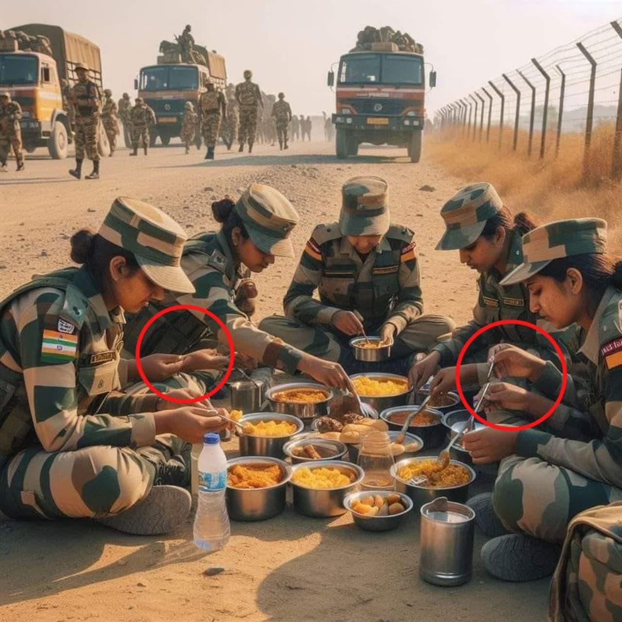 'രാജസ്ഥാനിലെ ബഡ്മെറില് 48 ഡിഗ്രി സെല്ഷ്യസ് ചൂടില് ജോലിക്കിടെ വനിതാ സൈനികര് റോഡിലിരുന്ന് ഭക്ഷണം കഴിക്കുന്നു. ഇന്ത്യ-പാക് അതിര്ത്തിയിലാണ് ഈ രംഗം. മേക്കപ്പ് അണിഞ്ഞവരോ അര്ധനഗ്നരായി നൃത്തം വയ്ക്കുന്നവരോ അല്ല, ഇവരാണ് യഥാര്ഥ ഹീറോസ് എന്ന് നിങ്ങള് മനസിലാക്കുക. ജയ് ജവാന്, ജയ് ഭാരത്' എന്നീ കുറിപ്പുകളോടെയാണ് ചിത്രം ട്വീറ്റ് ചെയ്യപ്പെടുന്നത്. നിലത്ത് വട്ടത്തിലിരുന്ന് ഭക്ഷണം കഴിക്കുന്ന ഇവര്ക്ക് പിന്നിലായി സൈനിക വാഹനങ്ങളും മറ്റനേകം സൈനികരെയും കാണാം.