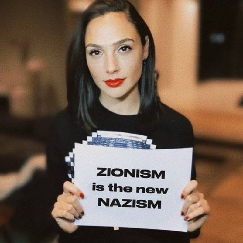 സയണിസം പുതിയ നാസിസം ആണ് എന്നെഴുതിയ പോസ്റ്റര് ഉയര്ത്തിപ്പിടിച്ച് ഗാൽ ഗാഡോട്ട് തന്റെ പ്രതിഷേധം അറിയിക്കുന്നു എന്നുപറഞ്ഞാണ് ചിത്രം