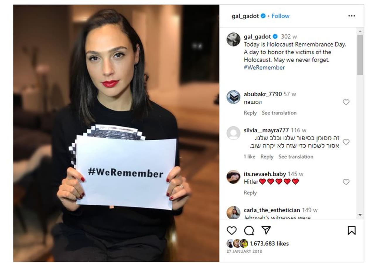 ഗാൽ ഗാഡോട്ടിന്റെ തന്നെ അഞ്ച് വര്ഷം പഴക്കമുള്ള ഒരു ചിത്രത്തില് പോസ്റ്റര് ഭാഗം എഡിറ്റ് ചെയ്താണ് വൈറല് ചിത്രം തയ്യാറാക്കിയിരിക്കുന്നത് എന്നാണ് പുറത്തുവരുന്ന വസ്തുത. #WeRemember എന്ന ഹാഷ്ടാഗ് എഴുതിയ പോസ്റ്റര് പിടിച്ചിരിക്കുന്ന ഒരു ചിത്രം 2018 ജനുവരി 27ന് ഗാൽ ഗാഡോട്ട് തന്റെ വെരിഫൈഡ് ഇന്സ്റ്റഗ്രാമില് പോസ്റ്റ് ചെയ്തിരുന്നു. ഇതിലെ #WeRemember എന്ന എഴുത്ത് മായിച്ച് പകരം ZIONISM is the new NAZISM എന്നെഴുതി കൃത്രിമമായി തയ്യാറാക്കിയ ചിത്രമാണ് ഇപ്പോള് സാമൂഹ്യമാധ്യമങ്ങളില് പ്രചരിക്കുന്നത് എന്നതാണ് യാഥാര്ഥ്യം. ഗാൽ ഗാഡോട്ടിന്റെ 2018ലെ ഇന്സ്റ്റ പോസ്റ്റിന്റെ സ്ക്രീന്ഷോട്ട് ചുവടെ.