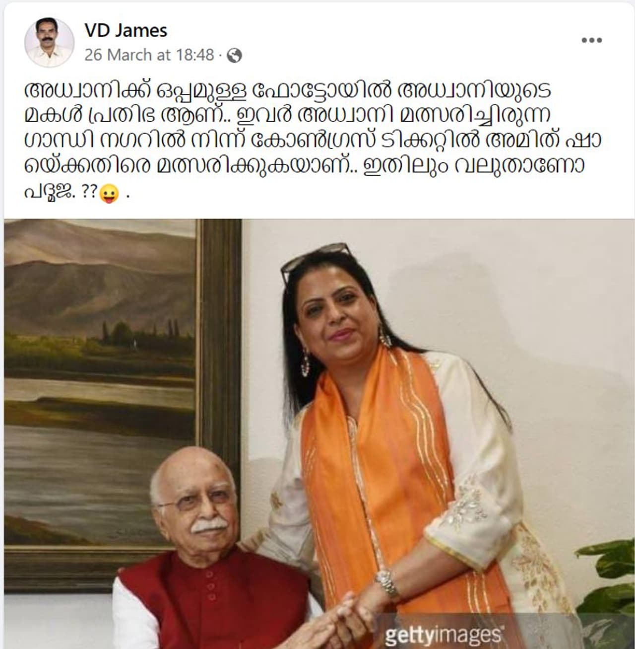'അദ്വാനിക്ക് ഒപ്പമുള്ള ഫോട്ടോയിൽ അദ്വാനിയുടെ മകൾ പ്രതിഭ ആണ്. ഇവർ അദ്വാനി മത്സരിച്ചിരുന്ന ഗാന്ധിനഗറിൽ നിന്ന് കോൺഗ്രസ് ടിക്കറ്റിൽ അമിത് ഷായ്ക്കെതിരെ മത്സരിക്കുകയാണ്.. ഇതിലും വലുതാണോ പദ്മജ. ??😛'- എന്നുമാണ് ഫേസ്ബുക്കില് വി ഡി ജയിംസ് എന്നയാളുടെ പോസ്റ്റ്. സമാന പോസ്റ്റുകള് മറ്റ് പലരും ചെയ്തിട്ടുണ്ട് എന്നും കാണാം. തെളിവായി സ്ക്രീന്ഷോട്ട് ചുവടെ ചേർക്കുന്നു.