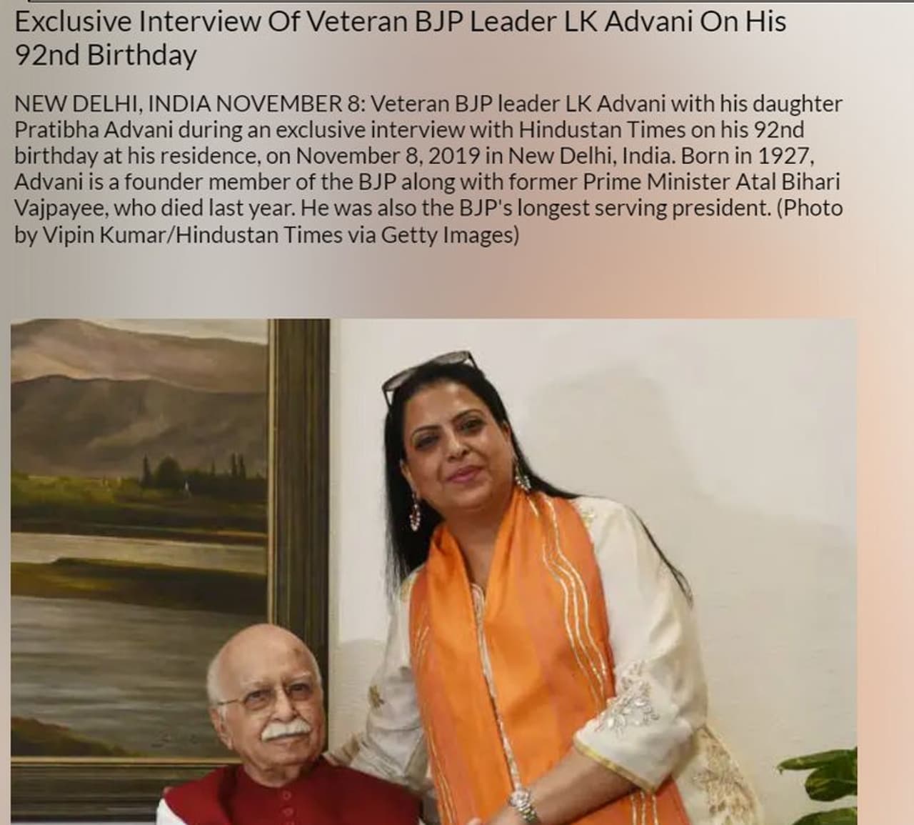 ചിത്രത്തില് എല് കെ അദ്വാനിക്കൊപ്പമുള്ളത് മകള് പ്രതിഭ അദ്വാനി തന്നെയാണ് എന്നത് വസ്തുതയാണ്. ഈ ചിത്രം ഗെറ്റി ഇമേജസ് 2019 നവംബർ എട്ടിന് പ്രസിദ്ധീകരിച്ചതാണെന്ന് കാണാം.