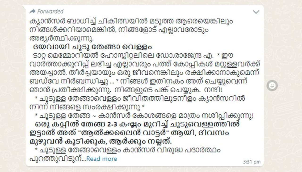 ചൂട് തേങ്ങാവെള്ളം ഉപയോഗിച്ച് ക്യാന്സര് കോശങ്ങളെ നശിപ്പിക്കാം എന്നൊരു പ്രചാരണം വാട്സ്ആപ്പ് മെസേജായി കറങ്ങിനടപ്പുണ്ട്. ടാറ്റ മെമ്മോറിയൽ ഹോസ്പിറ്റലിലെ ഡോ. രാജേന്ദ്ര എയാണ് ഇക്കാര്യം വ്യക്തമാക്കിയത് എന്നാണ് വിശദമായ കുറിപ്പില് പറയുന്നത്. ഇക്കാര്യം സത്യമോ?