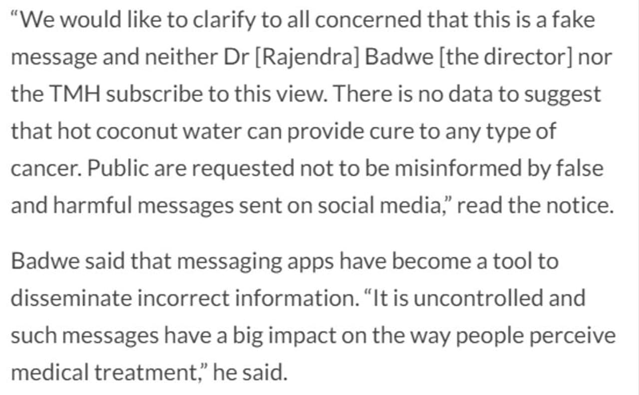ചൂടുള്ള തേങ്ങാവെള്ളം ഉപയോഗിച്ച് ക്യാന്സര് മാറ്റാമെന്ന പ്രചാരണം വ്യാജമാണ്. ടാറ്റ മെമ്മോറിയൽ ഹോസ്പിറ്റലിലെ ഡോ. രാജേന്ദ്ര ബഡ്വെയുടെ പേരിലുള്ള കുറിപ്പ് ആരും വിശ്വസിക്കരുത്.