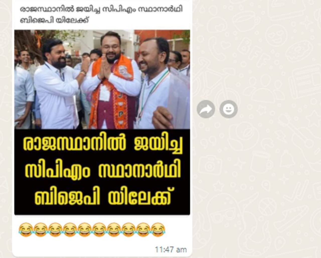 'രാജസ്ഥാനില് ജയിച്ച സിപിഎം സ്ഥാനാര്ഥി ബിജെപിയിലേക്ക്' എന്നാണ് ചിത്രം സഹിതം വിവിധ ഫേസ്ബുക്ക് പോസ്റ്റുകളിലുള്ളത്. ബിജെപി ഷാള് അണിഞ്ഞ് നില്ക്കുന്ന ഒരാളുടെ ചിത്രം കുറിപ്പുകള്ക്കൊപ്പം സോഷ്യല് മീഡിയ പോസ്റ്റുകളില് കാണാം.
