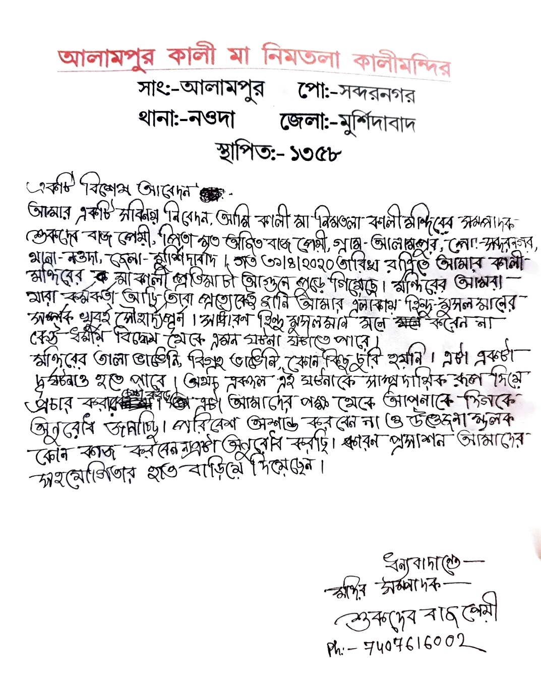 ക്ഷേത്രകമ്മിറ്റിയുടെ ബംഗാളിയിലുള്ള വിശദീകരണ കുറിപ്പിന്റെ ഉള്ളടക്കം ഇതാണ് - ഓഗസ്റ്റ് 31 രാത്രിയാണ് തീപിടുത്തം ഉണ്ടായത്, ഇവിടുത്തെ വിവിധ മതക്കാര് തമ്മില് സൌഹൃദത്തോടെയാണ് ജീവിക്കുന്നത്. ഇത്തരം ഒരു തീപിടുത്തം നടന്ന സംഭവത്തില് മതപരമായ വിദ്വേഷം കൊണ്ടുവാരാന് ശ്രമിക്കുന്നത് ശരിയല്ല. അമ്പലത്തിലെ എന്തെങ്കിലും തകര്ക്കപ്പെടുകയോ മോഷ്ടിക്കപ്പെടുകയോ ചെയ്തിട്ടില്ല. എന്നാല് ചിലര് ഇതിന് സാമുദായിക നിറം നല്കാന് ശ്രമിക്കുന്നു. അതിനാല് ഇത്തരക്കാരോട് സമാധാനം തകര്ക്കരുത് എന്ന് അഭ്യര്ത്ഥിക്കുന്നു. പൊലീസും അധികാരികളും ഞങ്ങളെ സഹായിക്കുന്നുണ്ട് "