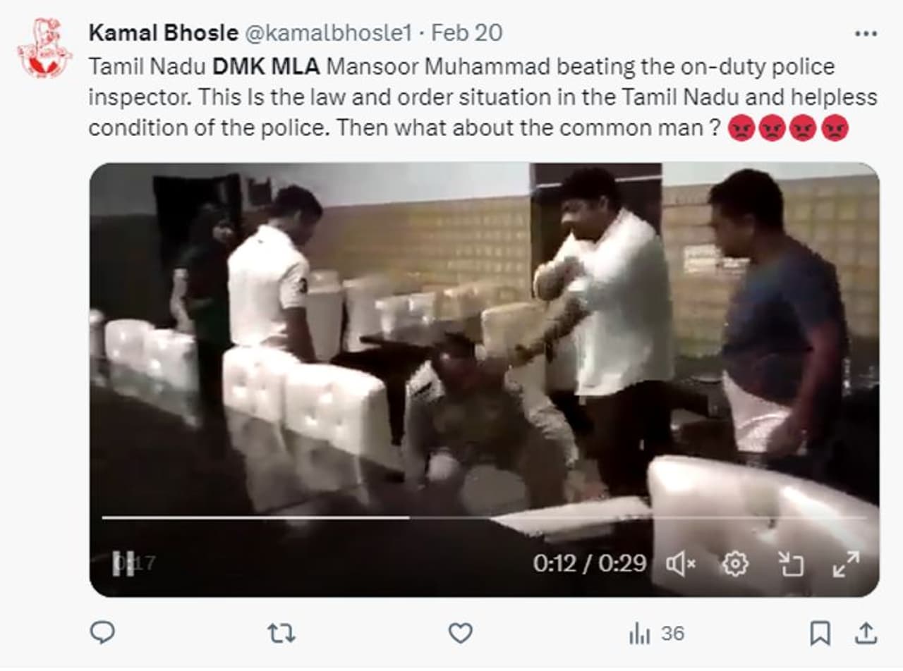 'ഡിഎംകെ എംഎല്എ മന്സൂര് മുഹമ്മദ് ഡ്യൂട്ടിയിലുള്ള തമിഴ്നാട് പൊലീസ് ഇന്സ്പെക്ടറെ തല്ലുകയാണ്. ജാതിയുടെയും ഭാഷയുടെയും അടിസ്ഥാനത്തില് സര്ക്കാരിനെ തെരഞ്ഞെടുത്താല് ഇതാണ് പ്രശ്നം. തമിഴ്നാട് പശ്ചിമ ബംഗാളായിക്കൊണ്ടിരിക്കുകയാണ്' എന്ന കുറിപ്പോടെയാണ് റിഷവ് സിംഗ് എന്ന എക്സ് യൂസര് 30 സെക്കന്ഡ് ദൈര്ഘ്യമുള്ള വീഡിയോ എക്സില് പങ്കുവെച്ചിരിക്കുന്നത്. പൊലീസുകാരനെ ഒരാള് ക്രൂരമായി മര്ദിക്കുന്നത് വീഡിയോയില് വ്യക്തമായി കാണാം. 'തമിഴ്നാട്ടിലെ നിയമവാഴ്ചയുടെ അവസ്ഥ ഇതാണ്, നിസ്സഹായരായ പൊലീസുകാരുടെ അവസ്ഥയും' എന്ന തലക്കെട്ടോടെയും വീഡിയോ ട്വീറ്റ് ചെയ്യപ്പെട്ടിട്ടുണ്ട്. ട്വീറ്റുകളുടെ ലിങ്കുകള് 1, 2, 3 എന്നിവയില് കാണാം.