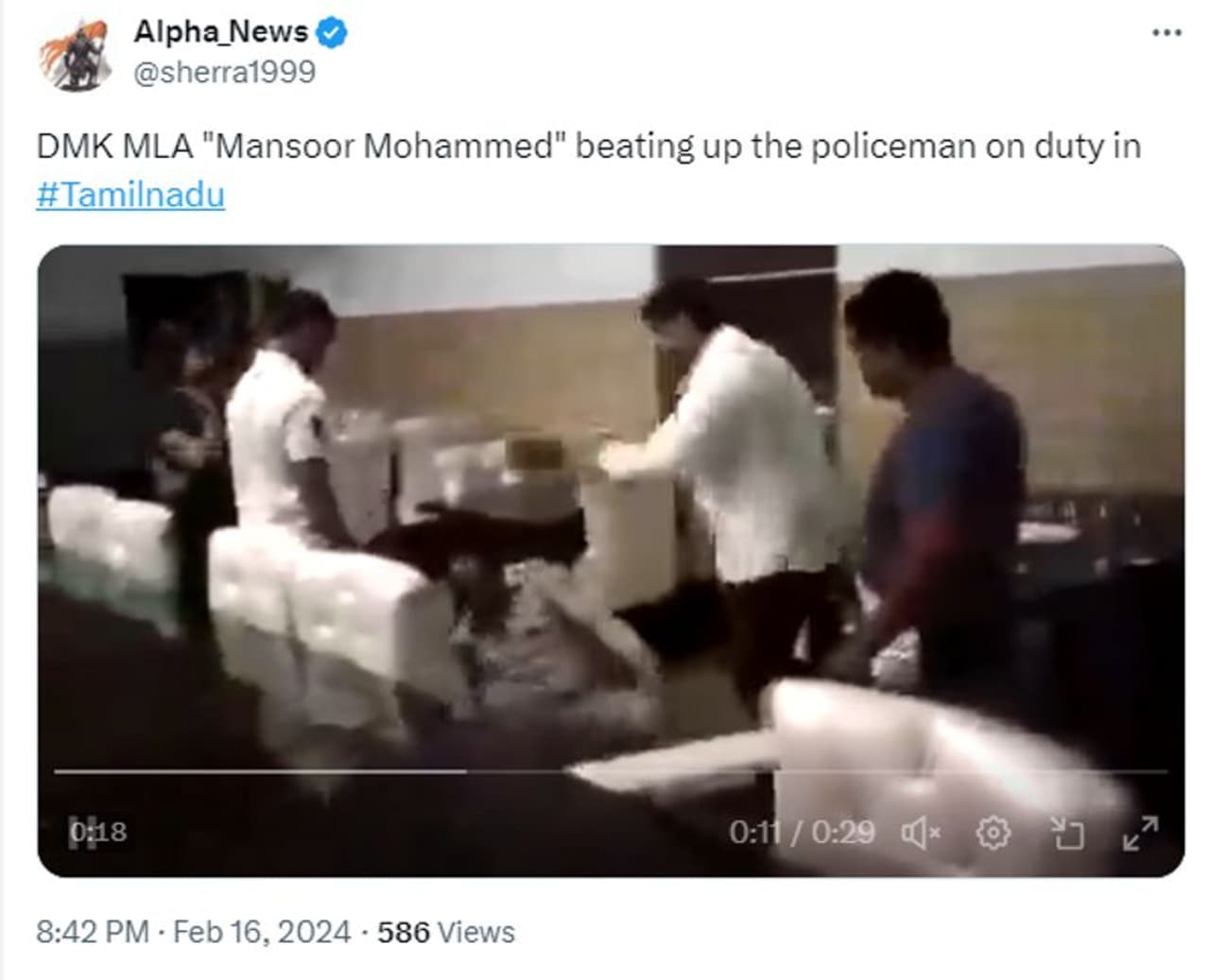 ഡിഎംകെ എംഎല്എ മന്സൂര് മുഹമ്മദ് ഡ്യൂട്ടിയിലുള്ള തമിഴ്നാട് പൊലീസ് ഇന്സ്പെക്ടറെ തല്ലുകയാണ് എന്ന കുറിപ്പോടെയാണ് വീഡിയോ