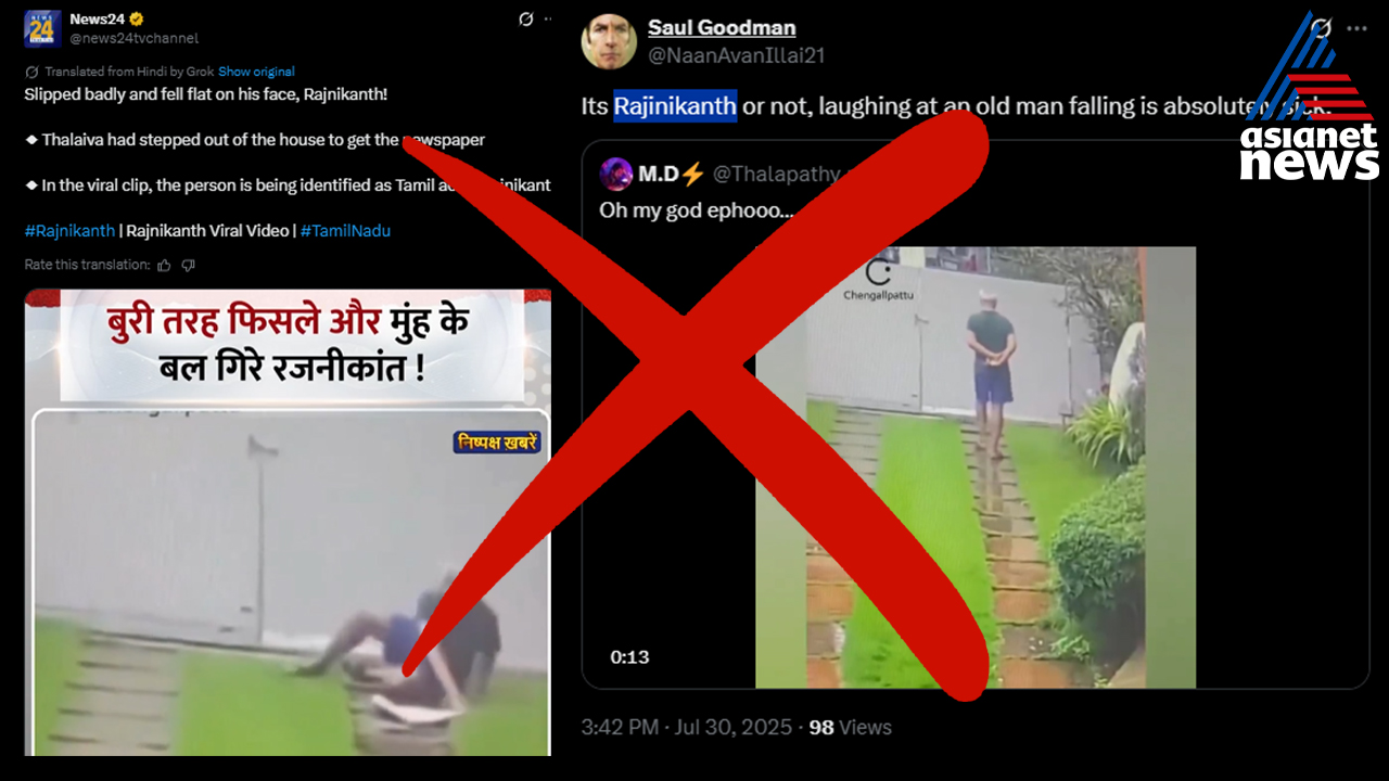ചെന്നൈ: നടന് രജനികാന്ത് സ്വന്തം വസതിയുടെ മുറ്റത്ത് നടക്കുന്നതിനിടെ തെന്നിവീണു എന്ന കുറിപ്പോടെ ഒരു സിസിടിവി വീഡിയോ എക്സ് അടക്കമുള്ള സോഷ്യല് മീഡിയ പ്ലാറ്റ്ഫോമുകളില് പലരും കണ്ടുകാണും. ആരാധകരുടെ തലൈവര്ക്ക് വീഴ്ചയില് പരിക്കേറ്റു എന്ന ആശങ്ക പങ്കുവെക്കുന്നുണ്ട് ഇതിന് പിന്നാലെ പല ആരാധകരും. ചിലരാവട്ടെ, വീഡിയോയിലുള്ളത് രജനികാന്ത് തന്നെയോ എന്ന് സംശയം പ്രകടിപ്പിക്കുകയും ചെയ്യുന്നു. ഈ പശ്ചാത്തലത്തില് വീഡിയോയുടെ യാഥാര്ഥ്യം പരിശോധിക്കാം.