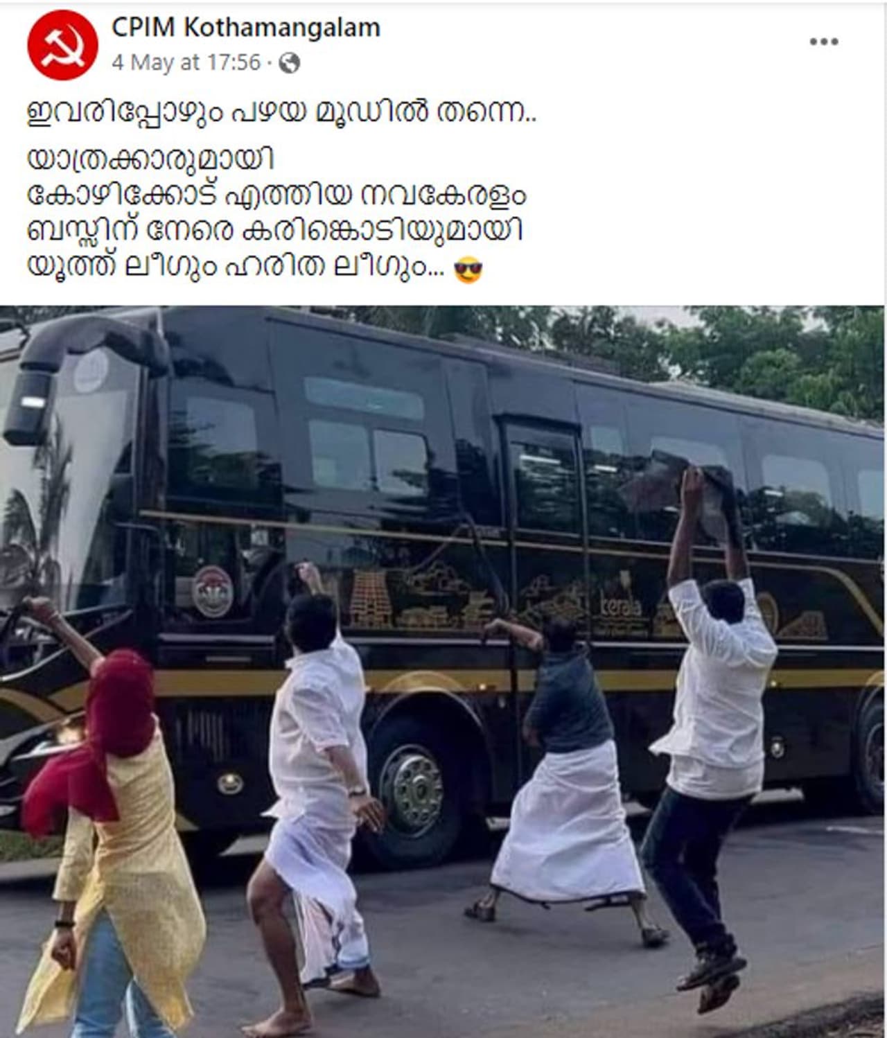 സിപിഐഎം കോതമംഗലം എന്ന ഫേസ്ബുക്ക് പേജില് മെയ് നാലിന് പ്രത്യക്ഷപ്പെട്ട പോസ്റ്റ് ചുവടെ കൊടുക്കുന്നു. നവകേരള സദസിന് ഉപയോഗിച്ച ബസിന് നേര്ക്ക് കരിങ്കൊടിയുമായി നാല് പേര് പ്രതിഷേധിക്കുന്നതാണ് ചിത്രത്തില്. ഈ ചിത്രത്തിനൊപ്പം ഒരു കുറിപ്പും പങ്കുവെച്ചിട്ടുണ്ട്. 'ഇവരിപ്പോഴും പഴയ മൂഡിൽ തന്നെ...യാത്രക്കാരുമായി കോഴിക്കോട് എത്തിയ നവകേരളം ബസിന് നേരെ കരിങ്കൊടിയുമായി യൂത്ത് ലീഗും ഹരിത ലീഗും'- എന്നാണ് ചിത്രം അടക്കമുള്ള സിപിഐഎം കോതമംഗലത്തിന്റെ എഫ്ബി പോസ്റ്റില് പറയുന്നത്.