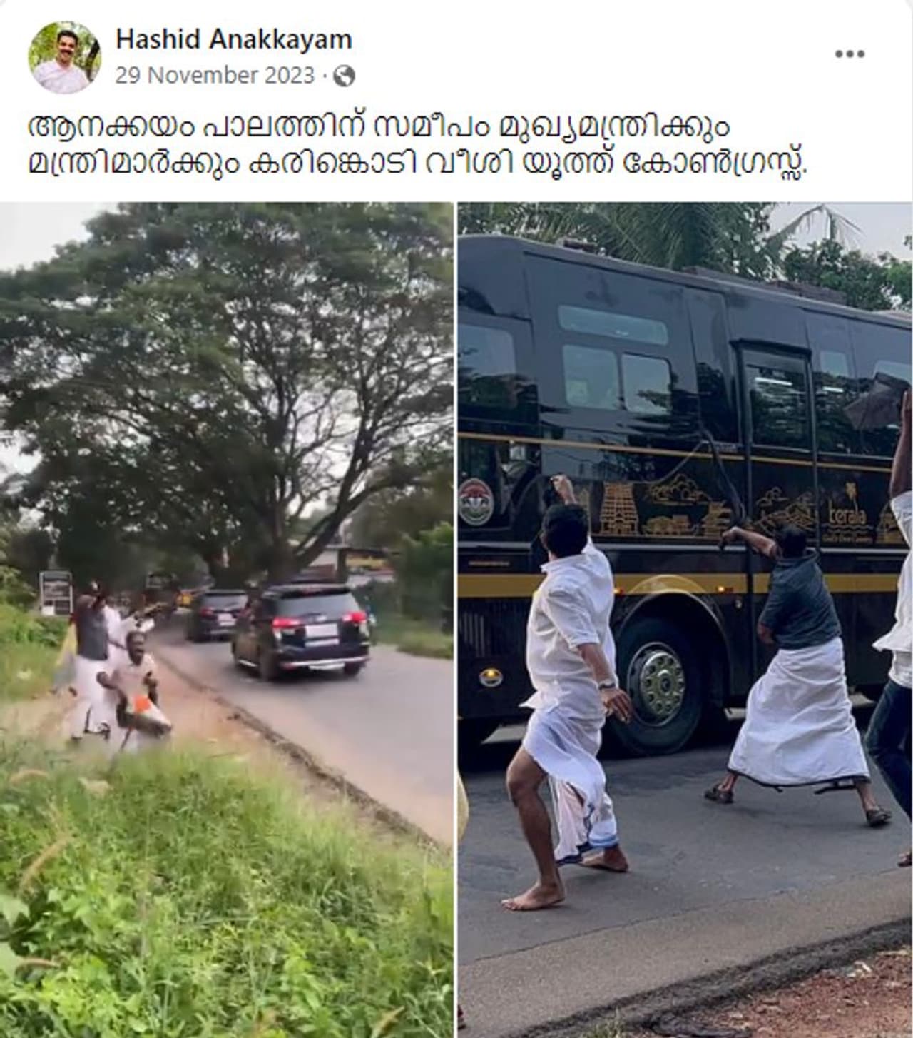 നവകേരള സദസിന് ഉപയോഗിച്ച ബസിന് നേര്ക്ക് കരിങ്കൊടിയുമായി നാല് പേര് പ്രതിഷേധിക്കുന്നതാണ് ചിത്രത്തില്