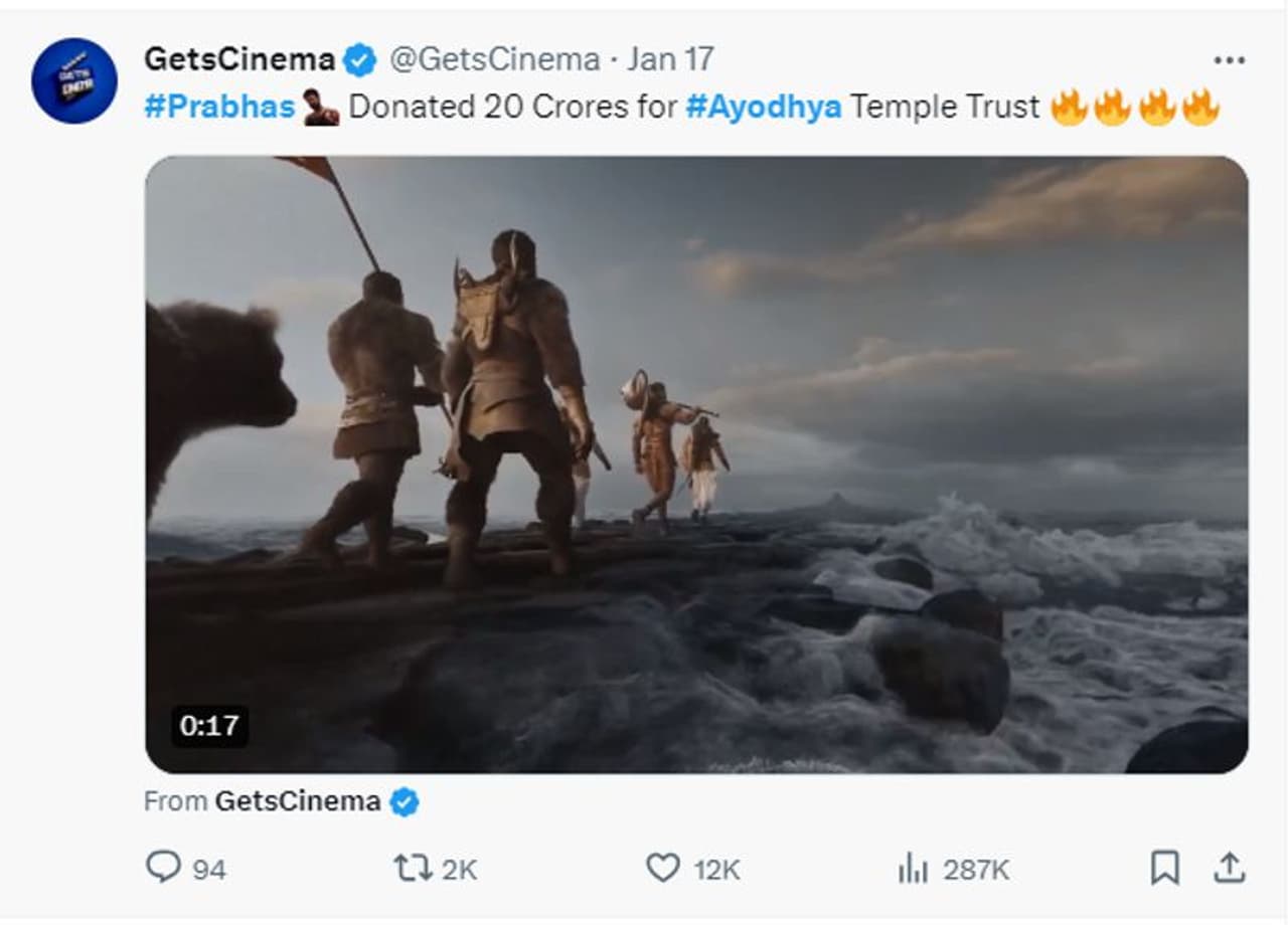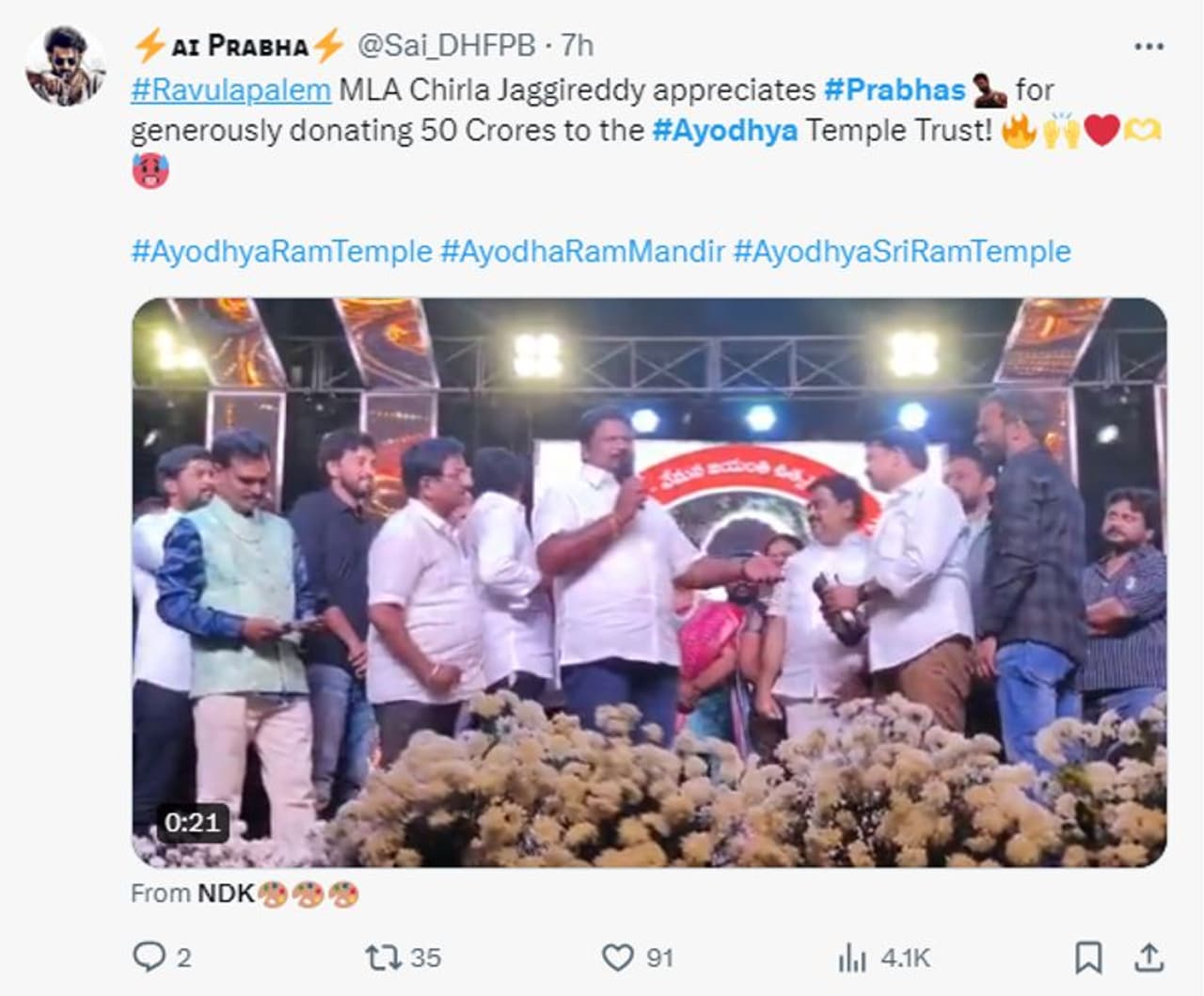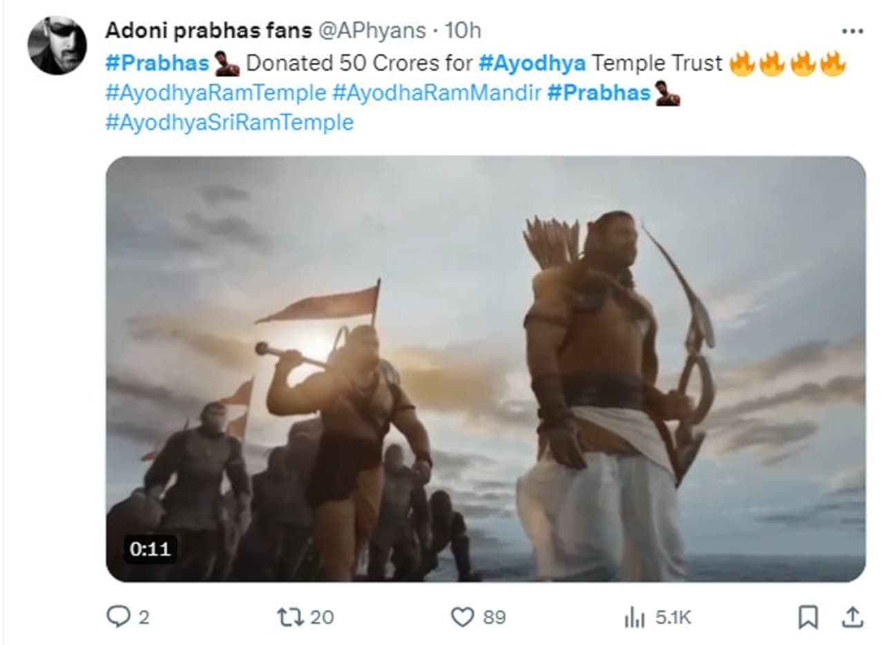 അയോധ്യ രാമക്ഷേത്ര ട്രസ്റ്റിന് പ്രഭാസ് 50 കോടി രൂപ സംഭാവന ചെയ്തതതായി നിരവധി ട്വീറ്റുകളാണുള്ളത്