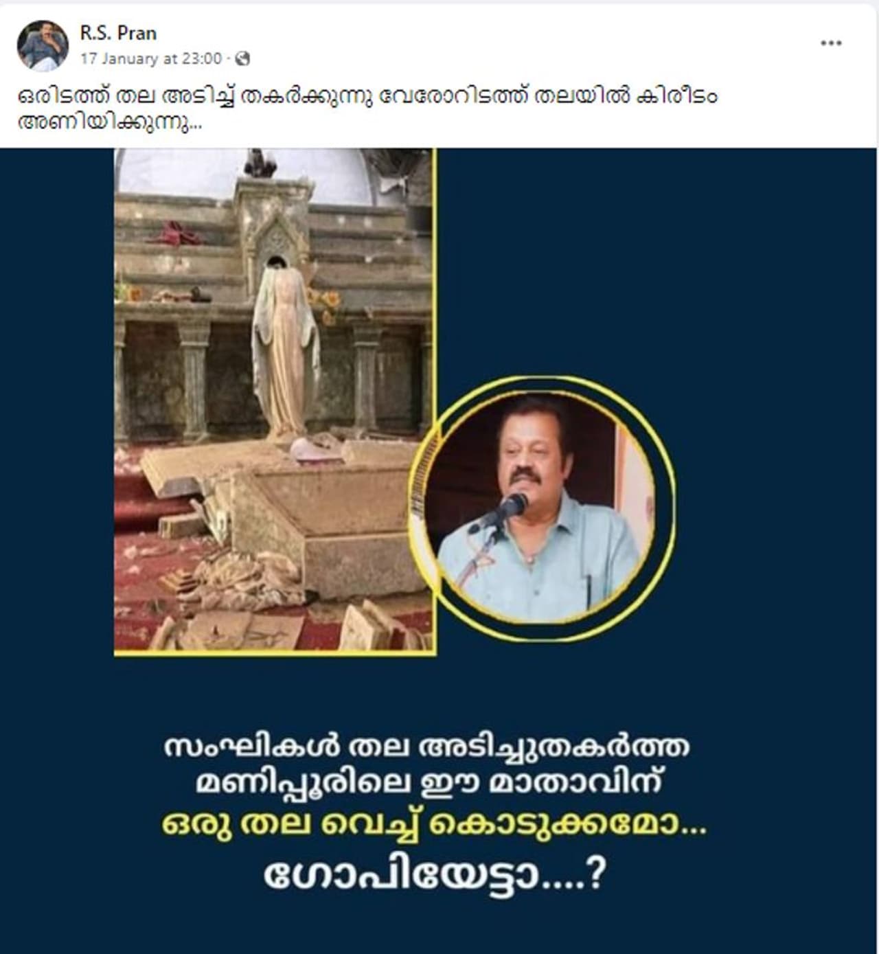 മണിപ്പൂരില് തല തകര്ക്കപ്പെട്ട കന്യാമറിയത്തിന്റെ പ്രതിമയുടെ ചിത്രം എന്ന അവകാശവാദത്തോടെയാണ് ഫോട്ടോ ഫേസ്ബുക്കില് പ്രചരിക്കുന്നത്. സുരേഷ് ഗോപിയുടെയും തല തകര്ക്കപ്പെട്ട നിലയിലുള്ള കന്യാമറിയത്തിന്റെ ഒരു ശില്പത്തിന്റെയും ഫോട്ടോകള് കൂട്ടിച്ചേര്ത്തിട്ടുള്ള കൊളാഷാണ് സോഷ്യല് മീഡിയയില് പ്രചരിക്കുന്നത്. 'സംഘികള് തല അടിച്ചുതകര്ത്ത മണിപ്പൂരിലെ ഈ മാതാവിന് ഒരു തല വെച്ച് കൊടുക്കുമോ ഗോപിയേട്ടാ?' എന്ന ചോദ്യം ഈ കൊളാഷില് എഴുതിയിരിക്കുന്നു. 'ഒരിടത്ത് തല അടിച്ച് തകർക്കുന്നു വേരോറിടത്ത് തലയിൽ കിരീടം അണിയിക്കുന്നു' എന്ന കുറിപ്പോടെയാണ് ഈ ചിത്രം എഫ്ബിയില് ആര് എസ് പ്രാണ് എന്നയാള് പോസ്റ്റ് ചെയ്തിരിക്കുന്നത്.