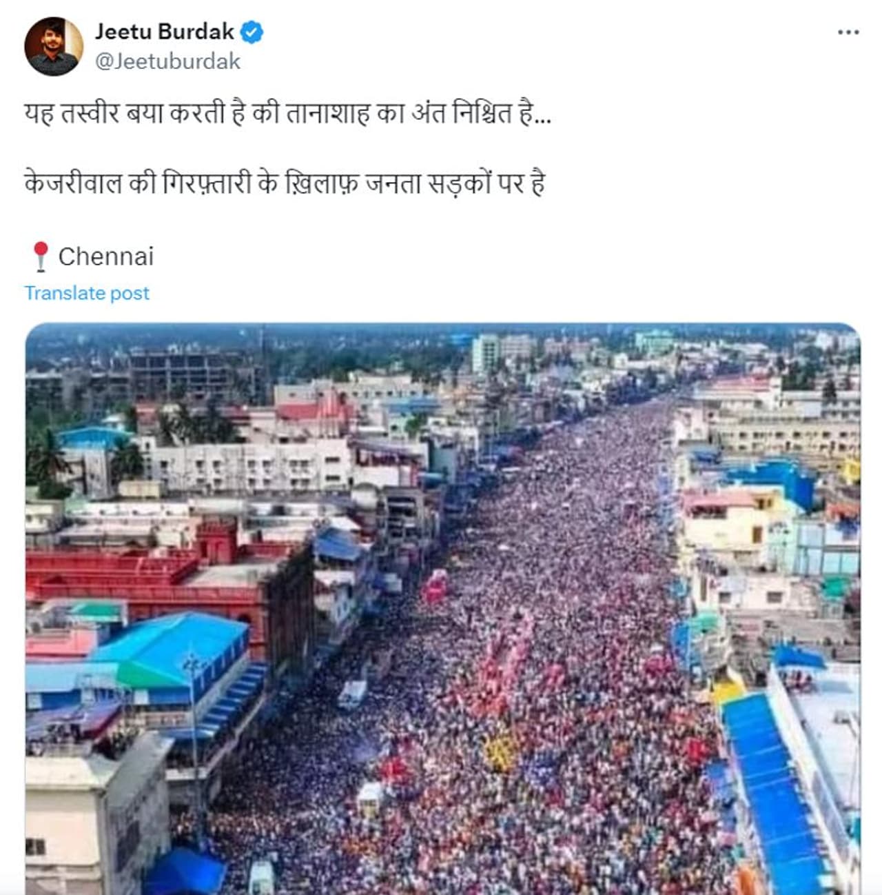 അരവിന്ദ് കെജ്രിവാളിന്റെ അറസ്റ്റില് പ്രതിഷേധിച്ച് ആയിരങ്ങള് അണിനിരന്ന പ്രതിഷേധ റാലി ചെന്നൈയില് നടന്നു എന്നാണ് സാമൂഹ്യമാധ്യമമായ എക്സിലെ പ്രചാരണം. 'ഏകാധിപത്യത്തിന്റെ അന്ത്യം അടുത്തിരിക്കുന്നതായി ഈ ചിത്രം വ്യക്തമാക്കുന്നു. കെജ്രിവാളിന്റെ അറസ്റ്റില് പ്രതിഷേധിക്കുന്ന ജനങ്ങളുടെ ചിത്രമാണ്' എന്ന കുറിപ്പോടെയാണ് ചിത്രം ജീത് ബുർദാക് എന്ന യൂസർ എക്സില് (ട്വിറ്റർ) പോസ്റ്റ് ചെയ്തിരിക്കുന്നത്. ചെന്നൈയാണ് ലൊക്കേഷന് എന്നും ട്വീറ്റില് രേഖപ്പെടുത്തിയിട്ടുണ്ട്.