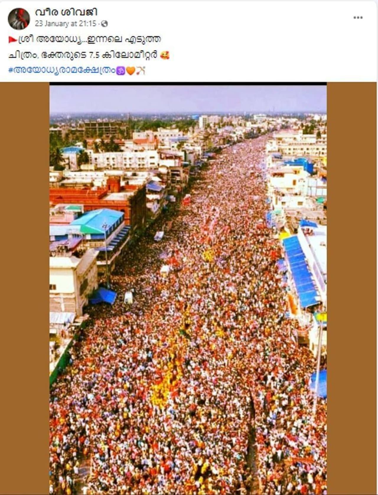 ഈ ചിത്രം സഹിതം നടക്കുന്നത് വ്യാജ പ്രചാരണമാണ് എന്നതാണ് വസ്തുത. ഇതേ ഫോട്ടോ അയോധ്യ രാമക്ഷേത്രത്തിന്റെ പ്രതിഷ്ഠാ കർമ്മത്തിന് ശേഷമുള്ള ആദ്യ ദിനത്തെ കാഴ്ചയാണിത് എന്ന അവകാശവാദത്തോടെ പ്രചരിച്ചിരുന്നതാണ്. അയോധ്യയിലെ ആദ്യ ദിനം അഞ്ച് ലക്ഷം ഭക്തര് എത്തി എന്ന അവകാശവാദത്തോടെ സമാന ഫോട്ടോ കേരളത്തിലടക്കം മലയാളം തലക്കെട്ടുകളില് പ്രചരിച്ചിരുന്നു. എന്നാല് അതും വ്യാജ പ്രചാരണമായിരുന്നു.