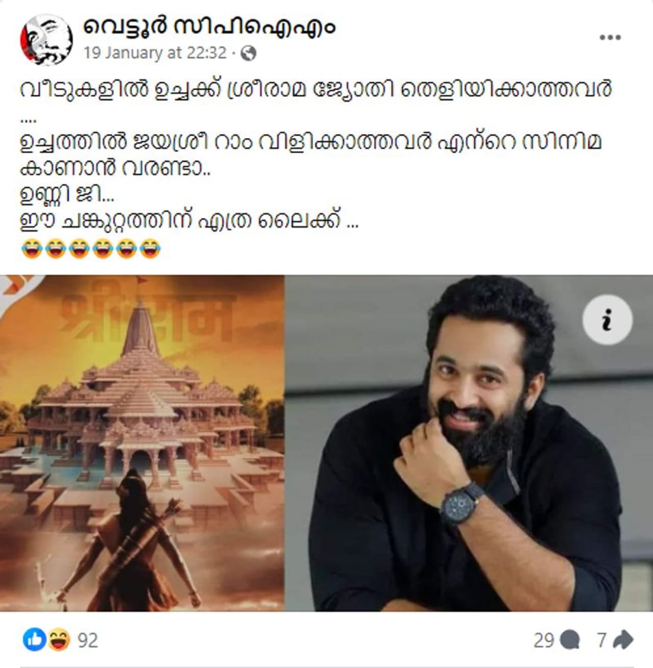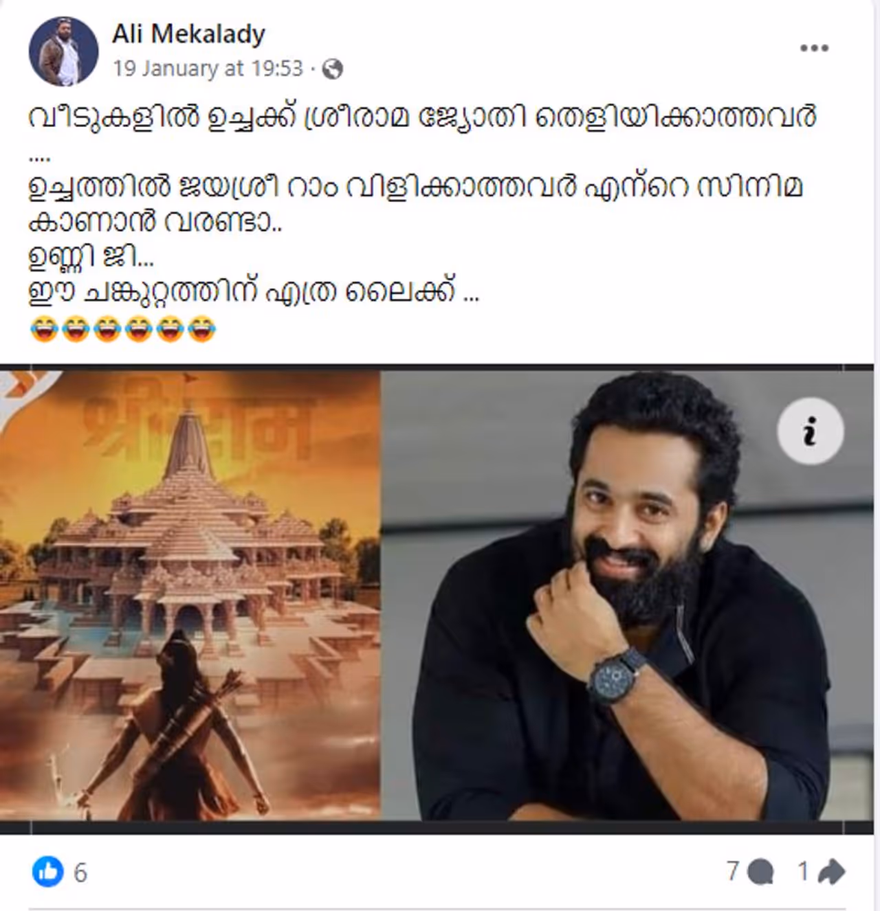 'വീടുകളിൽ ഉച്ചക്ക് ശ്രീരാമ ജ്യോതി തെളിയിക്കാത്തവർ... ഉച്ചത്തിൽ ജയ്ശ്രീറാം വിളിക്കാത്തവർ എന്റെ സിനിമ കാണാൻ വരണ്ടാ' എന്ന് ചലച്ചിത്ര താരം ഉണ്ണി മുകുന്ദന് പറഞ്ഞതായുള്ള പ്രസ്താവന ആരോ കെട്ടിച്ചമച്ചതാണ്. ഉണ്ണി മുകുന്ദന് ഇത്തരമൊരു പ്രസ്താവന നടത്തിയിട്ടില്ല.