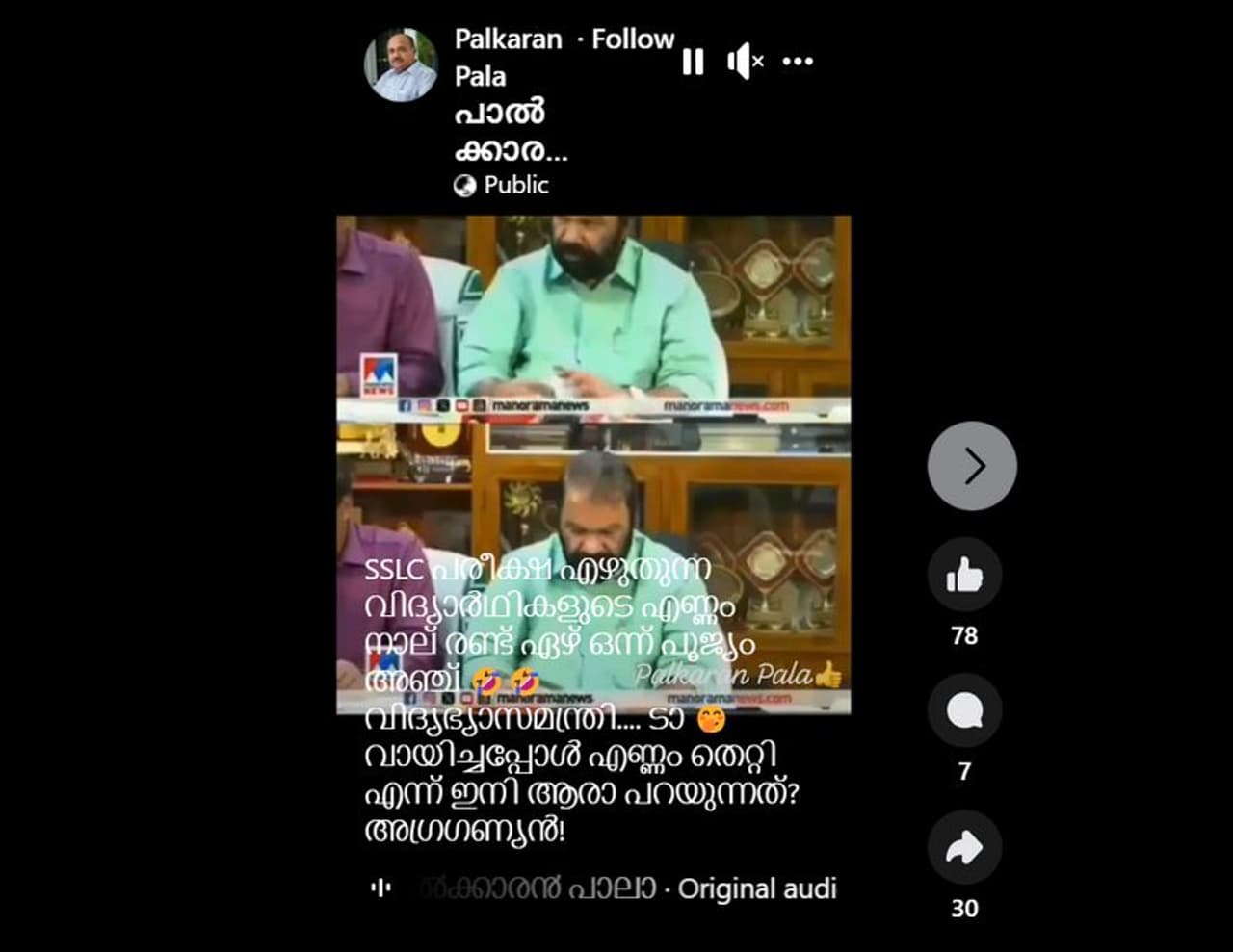 'SSLC പരീക്ഷ എഴുതുന്ന വിദ്യാർഥികളുടെ എണ്ണം നാല് രണ്ട് ഏഴ് ഒന്ന് പൂജ്യം അഞ്ച്' എന്നിങ്ങനെ തപ്പിത്തപ്പി വിദ്യാഭ്യാസ മന്ത്രി വി ശിവന്കുട്ടി പറഞ്ഞതായാണ് ഫേസ്ബുക്ക് പോസ്റ്റിലുള്ളത്. അക്കങ്ങള് എണ്ണിപ്പറഞ്ഞ് മന്ത്രി സംസാരിക്കുന്ന വീഡിയോയാണ് പാല്ക്കാരന് പാലാ എന്ന യൂസർ 2024 മാർച്ച് 1ന് ഫേസ്ബുക്കില് പോസ്റ്റ് ചെയ്തിരിക്കുന്നത്. മന്ത്രിയെ കളിയാക്കിക്കൊണ്ട് ട്രോള് രൂപത്തിലാണ് ഈ വീഡിയോ തയ്യാറാക്കിയിരിക്കുന്നത് എന്നും കാണാം.