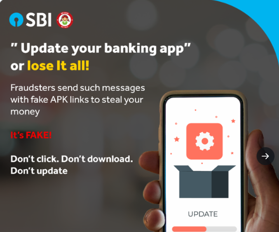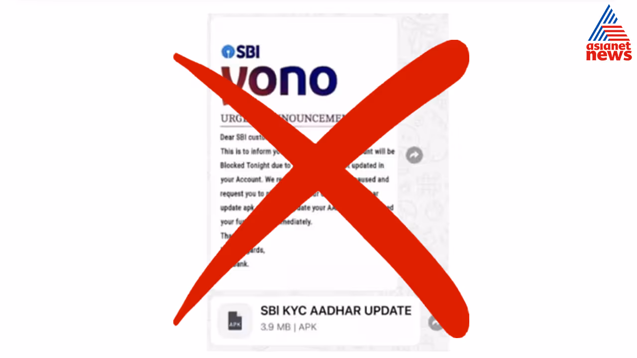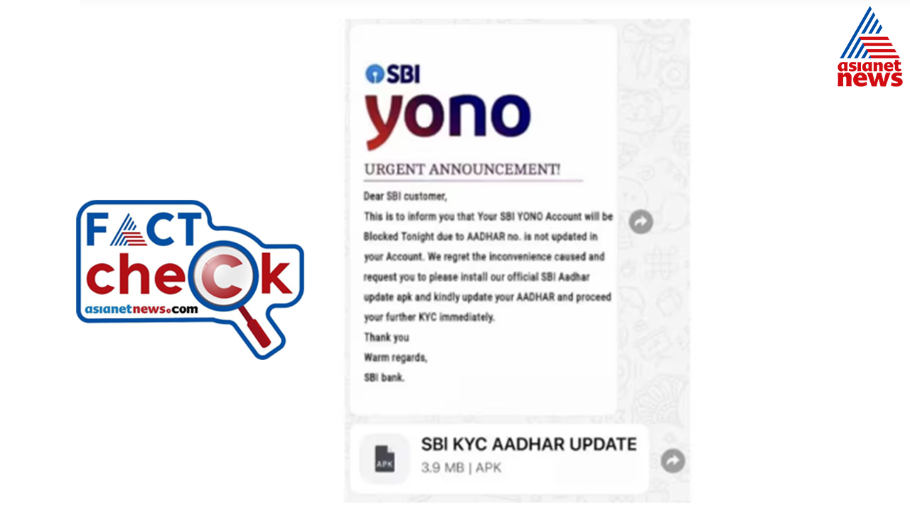 എസ്ബിഐ ഉപഭോക്താക്കള് അക്കൗണ്ടില് ആധാര് നമ്പര് അപ്ഡേറ്റ് ചെയ്യാനായി എപികെ ഫയല് ഡൗണ്ലോഡ് ചെയ്യാന് ആവശ്യപ്പെട്ടുകൊണ്ടും, അപ്ഡേറ്റ് ചെയ്തില്ലെങ്കില് യോനോ ആപ്പ് ബ്ലോക്ക് ചെയ്യപ്പെടും എന്ന തരത്തിലുമുള്ള വാട്സ്ആപ്പ് മെസേജുകള് വ്യാജമാണ്. ആരും ഇത്തരം മെസേജുകളില് ക്ലിക്ക് ചെയ്യരുത് എന്ന് എസ്ബിഐ തന്നെ അഭ്യര്ഥിച്ചിട്ടുണ്ട്.
