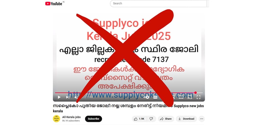 സപ്ലൈകോയില് പുതിയ ജോലി, നല്ല ശമ്പളം, നേരിട്ട് നിയമനം- എന്ന അവകാശവാദത്തോടെയുള്ള യൂട്യൂബ് വീഡിയോ വ്യാജമാണ്. 'ഓള് കേരള ജോബ്സ്' എന്ന യൂട്യൂബ് ചാനലില് പോസ്റ്റ് ചെയ്തിരിക്കുന്ന വീഡിയോയിലെ വിവരങ്ങള് തെറ്റാണെന്ന് സപ്ലൈകോ അറിയിച്ചു.