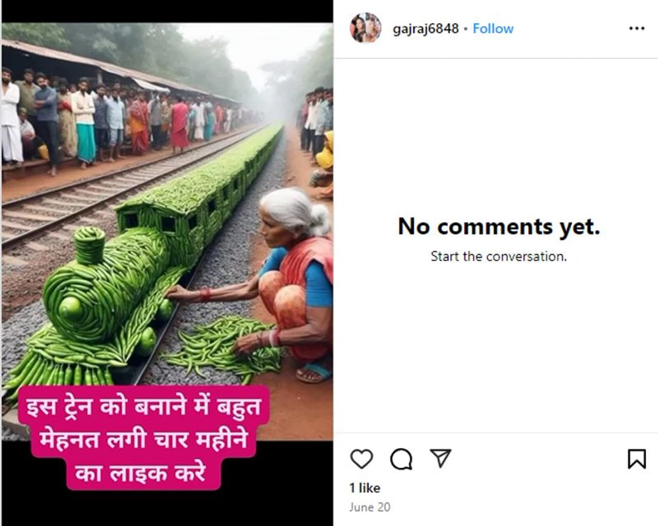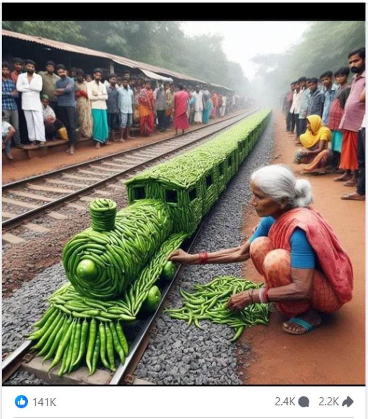 റെയില്വേ ട്രാക്കില് പച്ചമുളക് ഉപയോഗിച്ച് സൃഷ്ടിച്ച ട്രെയിന് മാതൃകയുടെ ചിത്രമാണ് ഏറെ പ്രശംസകളോടെ ഇന്സ്റ്റഗ്രാം, ഫേസ്ബുക്ക് അടക്കമുള്ള സാമൂഹ്യമാധ്യമങ്ങളില് പോസ്റ്റ് ചെയ്തിരിക്കുന്നത്. മുളകുകള് ഓരോന്നായി അടുക്കിവെക്കുന്ന ഒരു വൃദ്ധയെ സമീപത്തായി കാണാം. 10,000 പച്ചമുളകുകള് ഉപയോഗിച്ചാണ് ഈ ട്രെയിന് നിര്മിച്ചത് എന്നാണ് പോസ്റ്റുകളില് പറയുന്നത്. റെയില്വേ ട്രാക്കില് പച്ചമുളക് കൊണ്ട് ട്രെയിനിന്റെ മാതൃക ഈ വൃദ്ധ നിര്മിക്കുന്നത് ആകാംക്ഷയോടെ നോക്കിനില്ക്കുന്ന ആളുകളെയും ചിത്രത്തില് കാണാം.