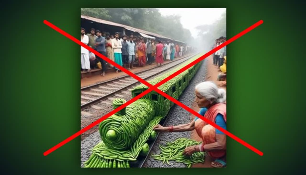 റെയില്വേ ട്രാക്കില് പച്ചമുളക് ഉപയോഗിച്ച് ട്രെയിനിന്റെ മാതൃക നിര്മിക്കുന്നതിന്റെ ഫോട്ടോ യഥാര്ഥമല്ല.