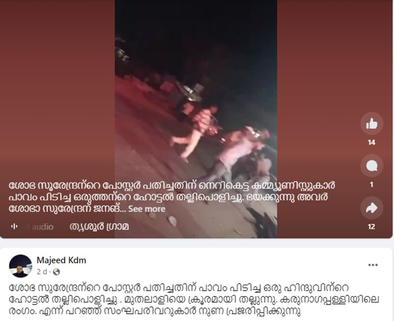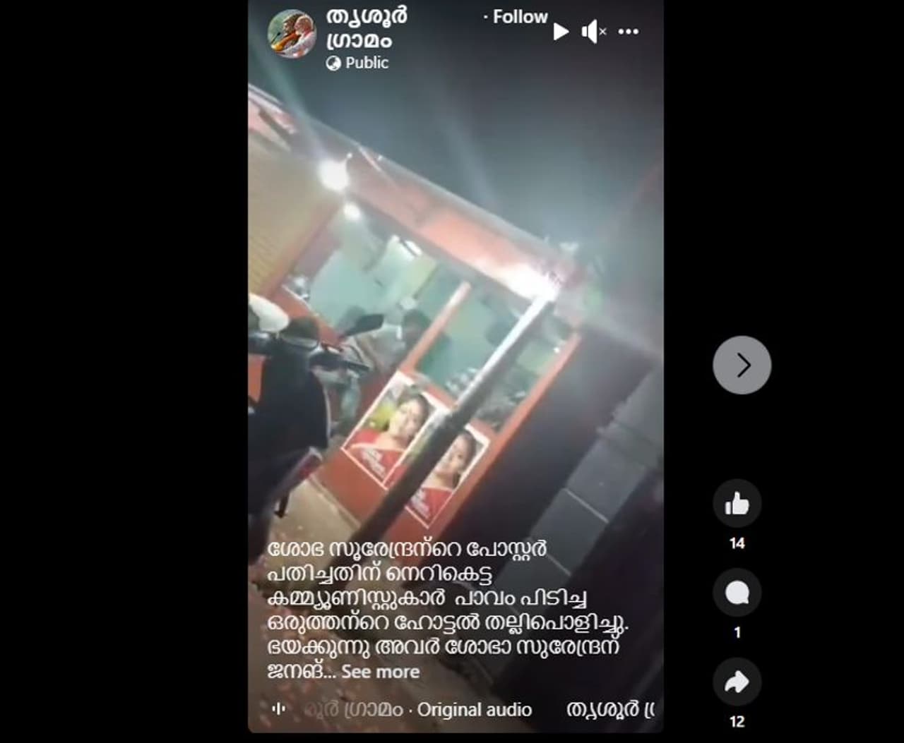 'ശോഭ സുരേന്ദ്രന്റെ പോസ്റ്റര് പതിച്ചതിന് നെറികെട്ട കമ്മ്യൂണിസ്റ്റുകാര് പാവം പിടിച്ച ഒരുത്തന്റെ ഹോട്ടല് തല്ലിപൊളിച്ചു. ഭയക്കുന്നു അവര് ശോഭ സുരേന്ദ്രനെ, ജനങ്ങള് കാണട്ടെ... ഒരു പോസ്റ്റര് പതിക്കാനുള്ള അവകാശവും ഈ നമ്പര് വണ് കേരളത്തില് ഇല്ലയോ'- എന്ന കുറിപ്പോടെയാണ് തൃശൂര് ഗ്രാമം എന്ന ഫേസ്ബുക്ക് അക്കൗണ്ടില് വീഡിയോ റീല്സായി പോസ്റ്റ് ചെയ്തിരിക്കുന്നത്. കുറേ യുവാക്കള് ചേര്ന്ന് ഒരു ഹോട്ടല് തല്ലിപ്പൊളിക്കുന്നതും മര്ദിക്കുന്നതുമാണ് വീഡിയോയിലുള്ളത്. കുറച്ചാളുകള് ഈ സംഭവമെല്ലാം നോക്കിനില്ക്കുന്നതും ദൃശ്യങ്ങളില് കാണാം.