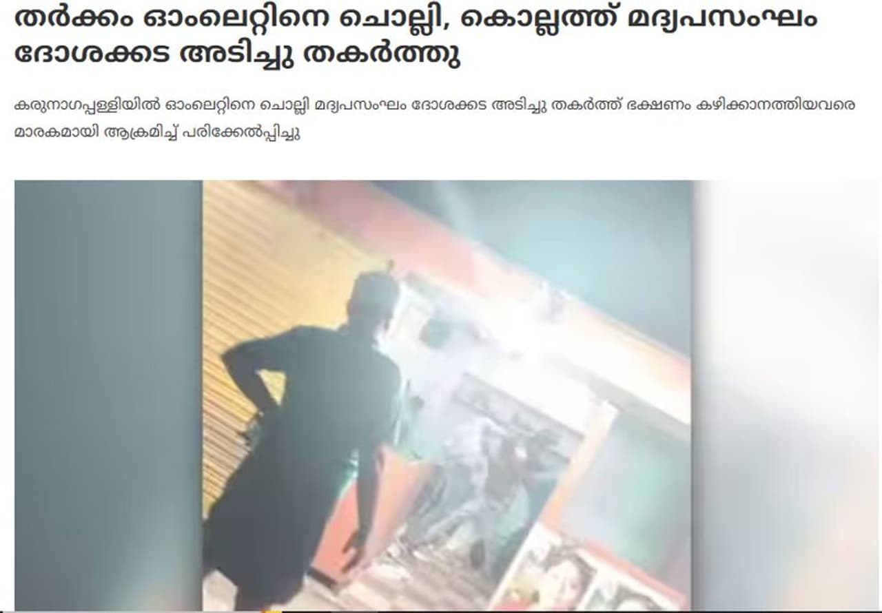 വീഡിയോയില് കാണുന്ന ഹോട്ടലിന്റെ മുന്വശത്ത് ശോഭ സുരേന്ദ്രന്റെ ഫോട്ടോകള് പതിച്ചിരിക്കുന്നതായി കാണാം. എന്നാല് ശോഭ സുരേന്ദ്രന്റെ ഫോട്ടോ പതിച്ചതിന്റെ പേരിലാണോ ഹോട്ടല് തകര്ത്തത്? ശോഭയുടെ പോസ്റ്റര് ആരെങ്കിലും നശിപ്പിച്ചതായോ നശിപ്പിക്കുന്നതായോ വീഡിയോയില് ഒരിടത്തും കാണാനായില്ല. അതിനാല് കരുനാഗപ്പള്ളിയില് ഇത്തരമൊരു സംഭവം നടന്നോ എന്നറിയാന് കീവേഡ് സെര്ച്ച് നടത്തി. ഇതില് ഏഷ്യാനെറ്റ് ന്യൂസ് ഓണ്ലൈന് 2024 മാര്ച്ച് 17ന് പ്രസിദ്ധീകരിച്ച വാര്ത്ത കാണാനിടയായി. 'തർക്കം ഓംലെറ്റിനെ ചൊല്ലി, കൊല്ലത്ത് മദ്യപസംഘം ദോശക്കട അടിച്ചു തകർത്തു' എന്ന തലക്കെട്ടിലാണ് വാര്ത്ത നല്കിയിരിക്കുന്നത്. എന്നാല് വാര്ത്തയില് ഒരിടത്തും രാഷ്ട്രീയപ്രേരിതമാണ് അക്രമം എന്ന് പറയുന്നില്ല.