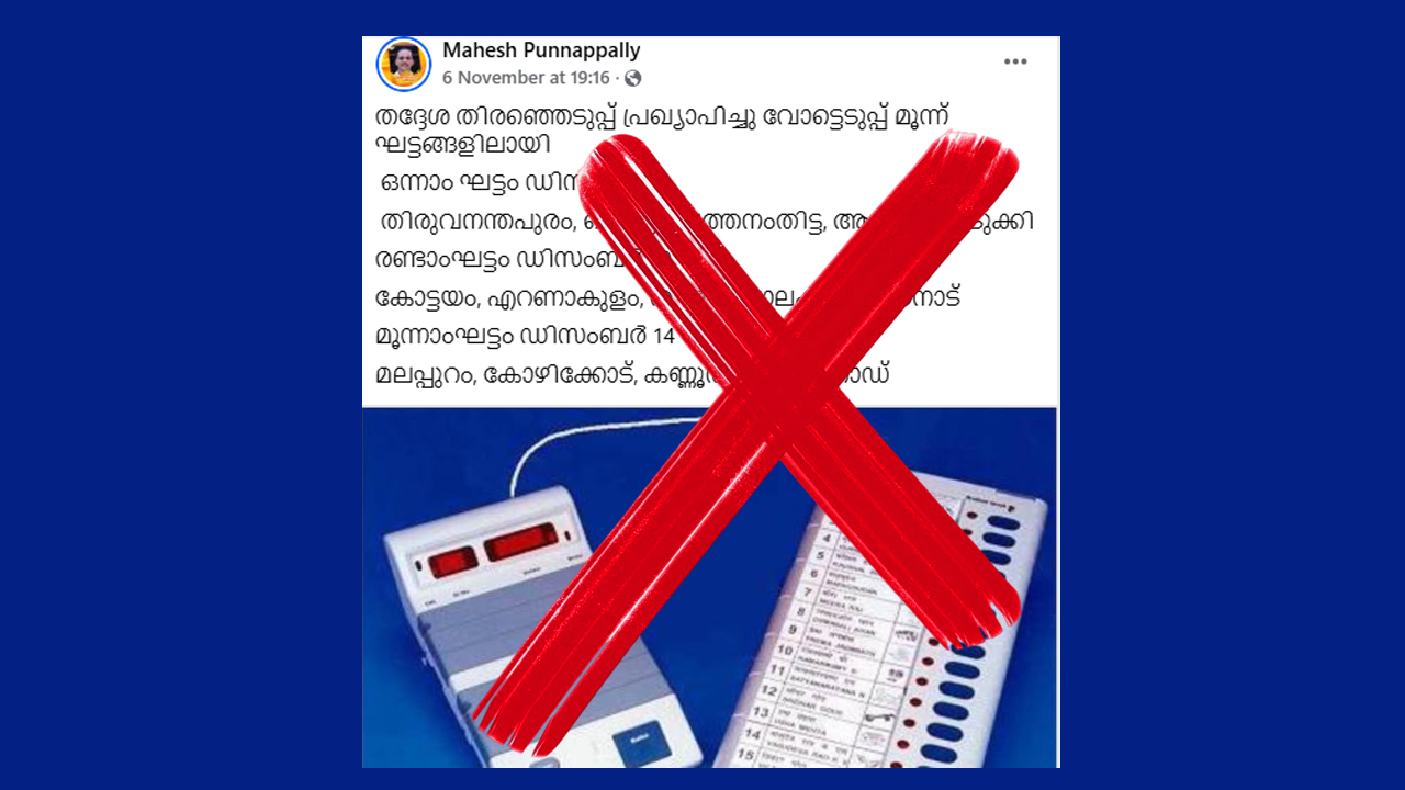 കേരളത്തിലെ തദ്ദേശ തിരഞ്ഞെടുപ്പുമായി ബന്ധപ്പെട്ട് സോഷ്യല് മീഡിയ പ്ലാറ്റ്ഫോമുകളില് പ്രചരിക്കുന്ന തെറ്റായ വിവരങ്ങള് താഴെ കൊടുക്കുന്നു.