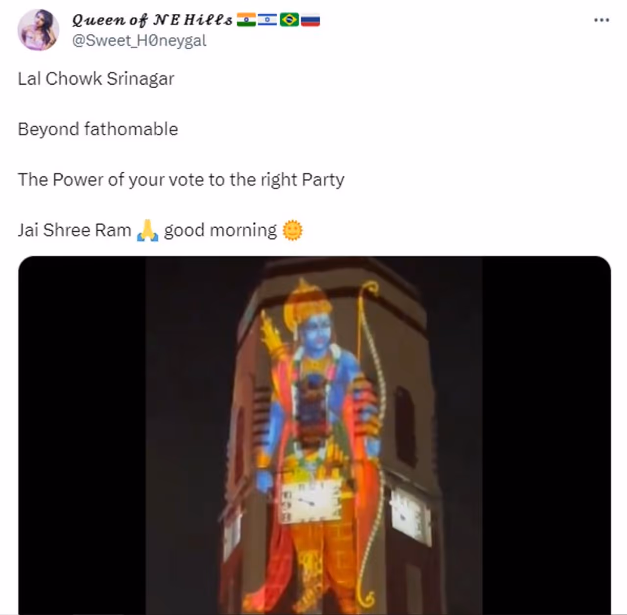 ശ്രീനഗറിലെ ലാല് ചൗക്കില് പ്രദര്ശിപ്പിച്ച ശ്രീരാമ രൂപം എന്ന അവകാശവാദത്തോടെ പ്രചരിക്കുന്ന വീഡിയോ ഉത്തരാഖണ്ഡിലെ ഡെറാഡൂണില് നിന്നുള്ളതാണ്.