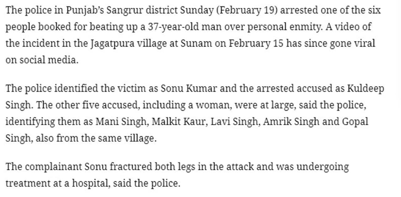വീഡിയോയുടെ ഫ്രെയിമുകള് റിവേഴ്സ് ഇമേജ് സെര്ച്ചിന് വിധേയമാക്കിയപ്പോഴാണ് ഇക്കാര്യങ്ങള് വ്യക്തമായത്. റിവേഴ്സ് ഇമേജ് സെര്ച്ചില് വീഡിയോ സംബന്ധിച്ച മാധ്യമവാര്ത്തകള് ലഭിച്ചു. എന്നാല് ഈ വാര്ത്തകളില് ഒരിടത്തും ഇതൊരു വര്ഗീയ പ്രശ്നമാണ് എന്ന് പറയുന്നില്ല. പഞ്ചാബിലെ സാംഗ്രൂരില് വച്ച് മുപ്പത്തിയേഴ് വയസുകാരനായ സോനു കുമാര് എന്നയാളെ ആറ് പേര് ചേര്ന്ന് മര്ദിച്ചതായാണ് വാര്ത്തകളില് പറയുന്നത്. സംഭവത്തെ കുറിച്ച് ഇന്ത്യന് എക്സ്പ്രസ്, ന്യൂസ് 18, പഞ്ചാബ് കേസരി എന്നീ മാധ്യമങ്ങള് 2023 ഫെബ്രുവരിയില് വാര്ത്ത പ്രസിദ്ധീകരിച്ചിട്ടുണ്ട്. വ്യക്തിവൈരാഗ്യമാണ് ആക്രമണത്തിന് കാരണം എന്ന് വാര്ത്തകളിലുണ്ട്.