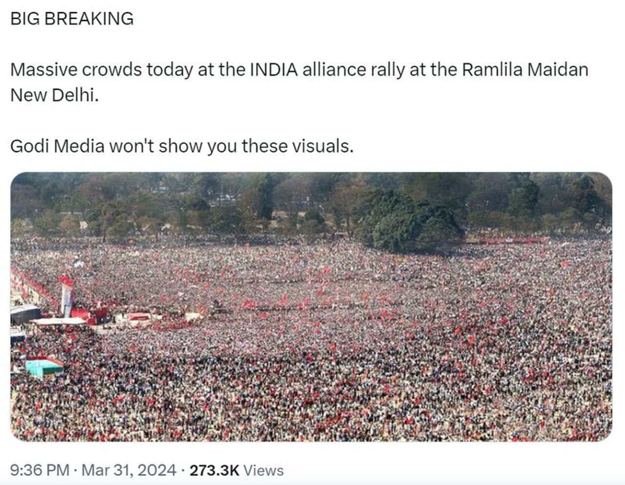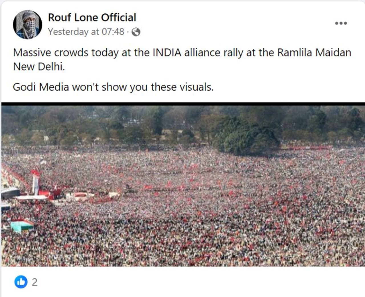 'രാംലീല മൈതാനിയില് ഇന്ത്യാ സഖ്യത്തിന്റെ റാലിയില് വലിയ ജനക്കൂട്ടം എത്തി, ഗോഡി മീഡിയ ഈ ദൃശ്യങ്ങള് സംപ്രേഷണം ചെയ്യില്ല' എന്ന കുറിപ്പോടെയാണ് ഫോട്ടോ പോസ്റ്റ് ചെയ്തിരിക്കുന്നത്