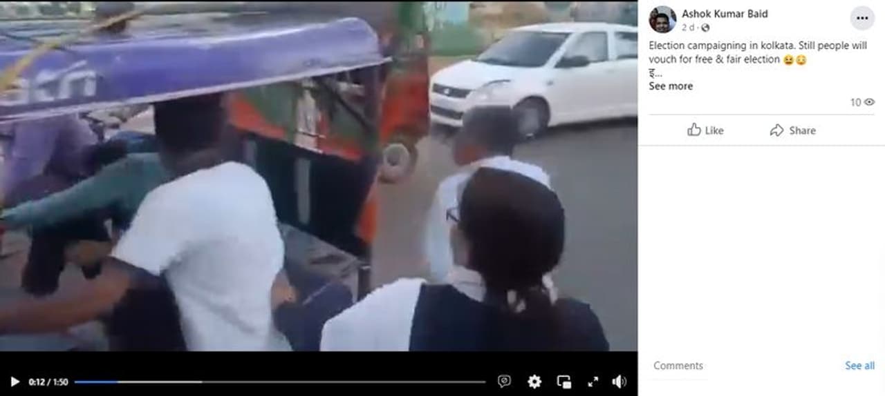 പശ്ചിമ ബംഗാളിലെ കൊല്ക്കത്തയില് ലോക്സഭ തെരഞ്ഞെടുപ്പ് 2024 പ്രചാരണത്തിനിടെ സംഘര്ഷമുണ്ടായതിന്റെ ദൃശ്യങ്ങള് എന്ന തലക്കെട്ടോടെയാണ് വീഡിയോ വ്യാപകമായി പ്രചരിക്കുന്നത്. സോഷ്യല് മീഡിയ പ്ലാറ്റ്ഫോമുകളായ എക്സിലും ഫേസ്ബുക്കിലും വാട്സ്ആപ്പിലും ഈ ദൃശ്യങ്ങള് വൈറലാണ്. കൊല്ക്കത്തയിലെ തെരഞ്ഞെടുപ്പ് പ്രചാരണം...നീതിയുക്തമായ തെരഞ്ഞെടുപ്പാണോ നടക്കുന്നത് എന്ന ചോദ്യത്തോടെയാണ് വീഡിയോ അനവധിയാളുകള് ഷെയര് ചെയ്യുന്നത്.