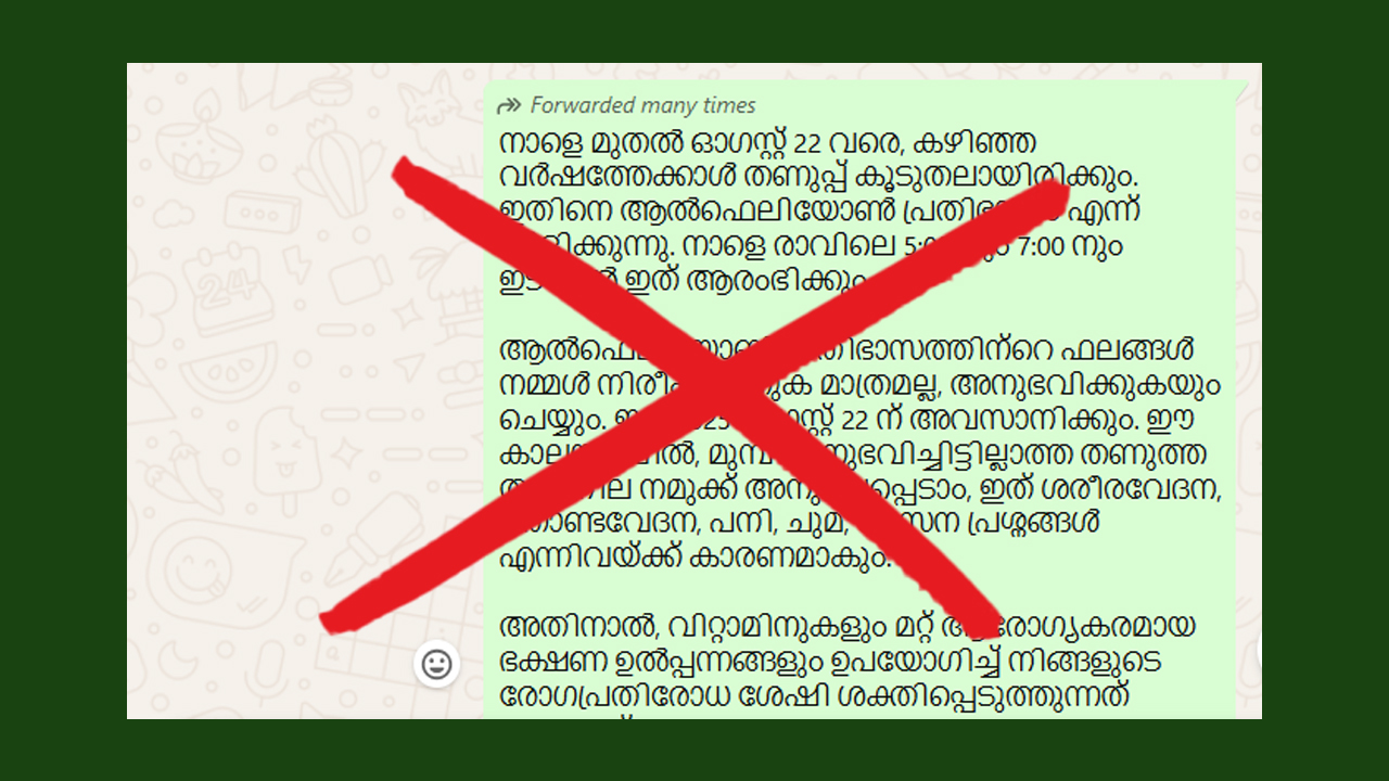 ആൽഫെലിയോൺ പ്രതിഭാസം നിലനില്ക്കുന്നതായും ഓഗസ്റ്റ് 22 വരെ കേരളത്തില് കഴിഞ്ഞ വർഷത്തേക്കാൾ തണുപ്പ് കൂടുതലായിരിക്കും എന്നുമുള്ള വാട്സ്ആപ്പ് ഫോര്വേഡ് വ്യാജമായിരുന്നു. ആൽഫെലിയോൺ പ്രതിഭാസം ശരീരവേദന, തൊണ്ടവേദന, പനി, ചുമ, ശ്വസന പ്രശ്നങ്ങൾ എന്നിവയ്ക്ക് കാരണമാകും എന്ന പ്രചാരണവും ആരും വിശ്വസിക്കേണ്ടതില്ലെന്ന് പിന്നീട് വ്യക്തമായി. വാട്സ്ആപ്പ് മെസേജിലെ വിവരങ്ങളെല്ലാം വസ്തുതാവിരുദ്ധമായിരുന്നു. കേരളത്തിലെ ജനങ്ങളെ ഭയപ്പെടുത്താന് ആരോ മനപ്പൂര്വം പടച്ചുവിട്ടതായിരിക്കണം ഈ വാട്സ്ആപ്പ് ഫോര്വേഡ്. അത് വ്യാപകമായി ഷെയര് ചെയ്യപ്പെടുകയും ചെയ്തു.