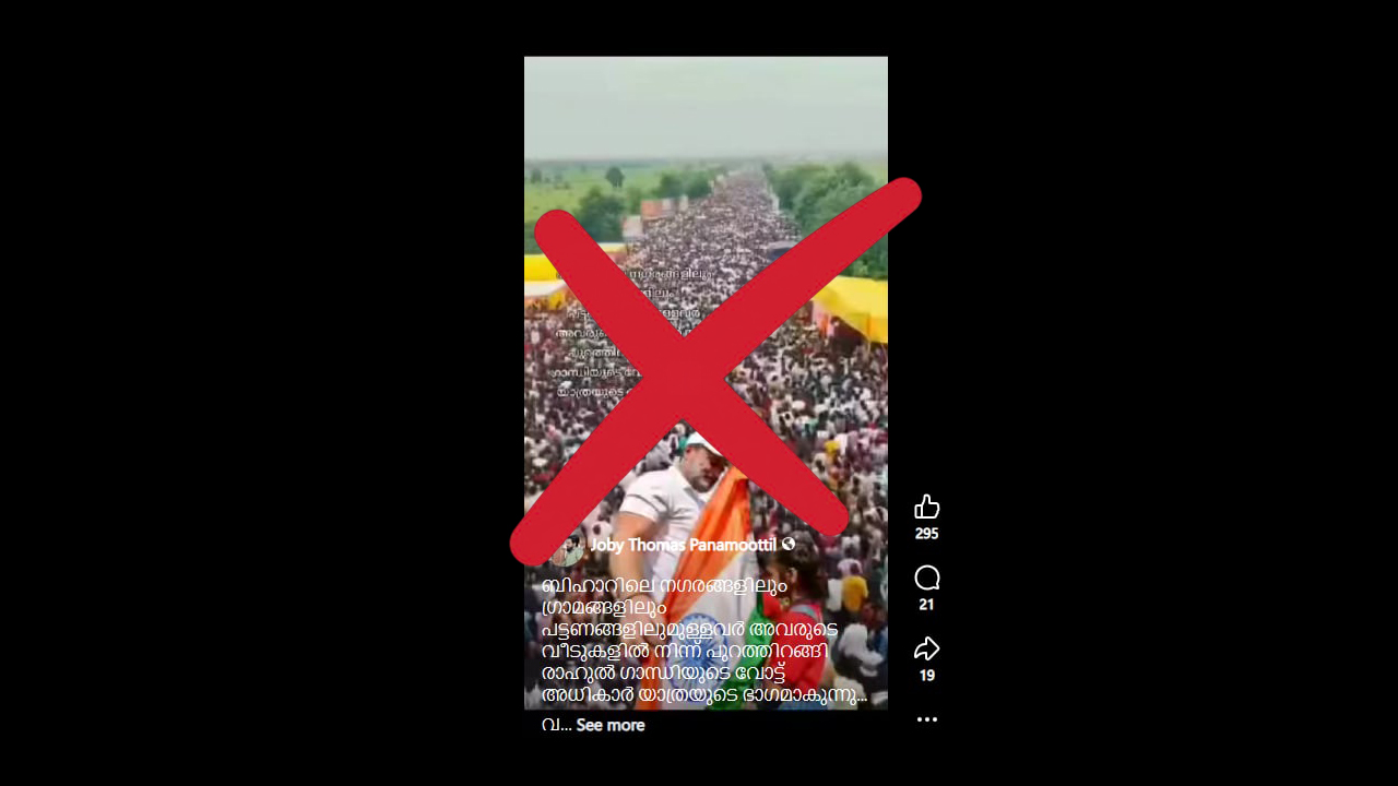 മറ്റൊരു പ്രചാരണം വോട്ടര് അധികാര് യാത്രയെ കുറിച്ചായിരുന്നു. ബിഹാറിൽ കോണ്ഗ്രസ് നേതാവ് രാഹുൽ ഗാന്ധി നടത്തുന്ന വോട്ടര് അധികാർ യാത്ര വലിയ ശ്രദ്ധയാകര്ഷിക്കുകയാണ്. വോട്ട് അധികാർ യാത്രയിൽ നിന്നുള്ള ദൃശ്യം എന്ന അവകാശവാദത്തോടെ ഇതിനിടെയൊരു വീഡിയോ ഫേസ്ബുക്ക് അടക്കമുള്ള സമൂഹമാധ്യമങ്ങളിൽ പ്രചരിച്ചു. വിശാലമായൊരു റോഡിലൂടെ വലിയെ ജനക്കൂട്ടം നടന്നുനീങ്ങുന്ന ദൃശ്യമാണിത്. എണ്ണിയാല് തീരാത്ത മനുഷ്യരെ ഈ വീഡിയോയില് കാണാം. മലയാളം കുറിപ്പുകളോടെ കേരളത്തിലും ഈ വീഡിയോ എഫ്ബിയില് വൈറലായി.