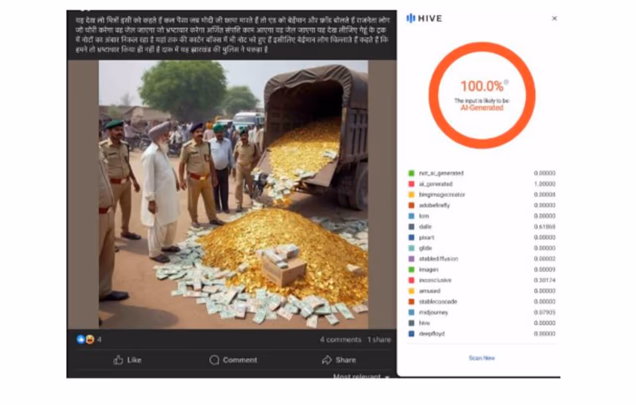 ജാര്ഖണ്ഡില് ഒരു ട്രക്കില് കടത്തുകയായിരുന്ന സ്വര്ണനാണയങ്ങളും നോട്ടുകളും പിടികൂടിയെന്നാണ് ചിത്രം സഹിതമുള്ള ഫേസ്ബുക്ക് പോസ്റ്റുകളില് പറയുന്നത്. ട്രക്കില് നിന്ന് വലിച്ച് പുറത്തിട്ടനിലയില് പണത്തിന്റെയും സ്വര്ണനായണത്തിന്റെയും ശേഖരം ഫോട്ടോയില് കാണാം. ഇതിന് സമീപം ചില പൊലീസ് ഉദ്യോഗസ്ഥര് നില്ക്കുന്നതും ചിത്രത്തിലുണ്ട്.